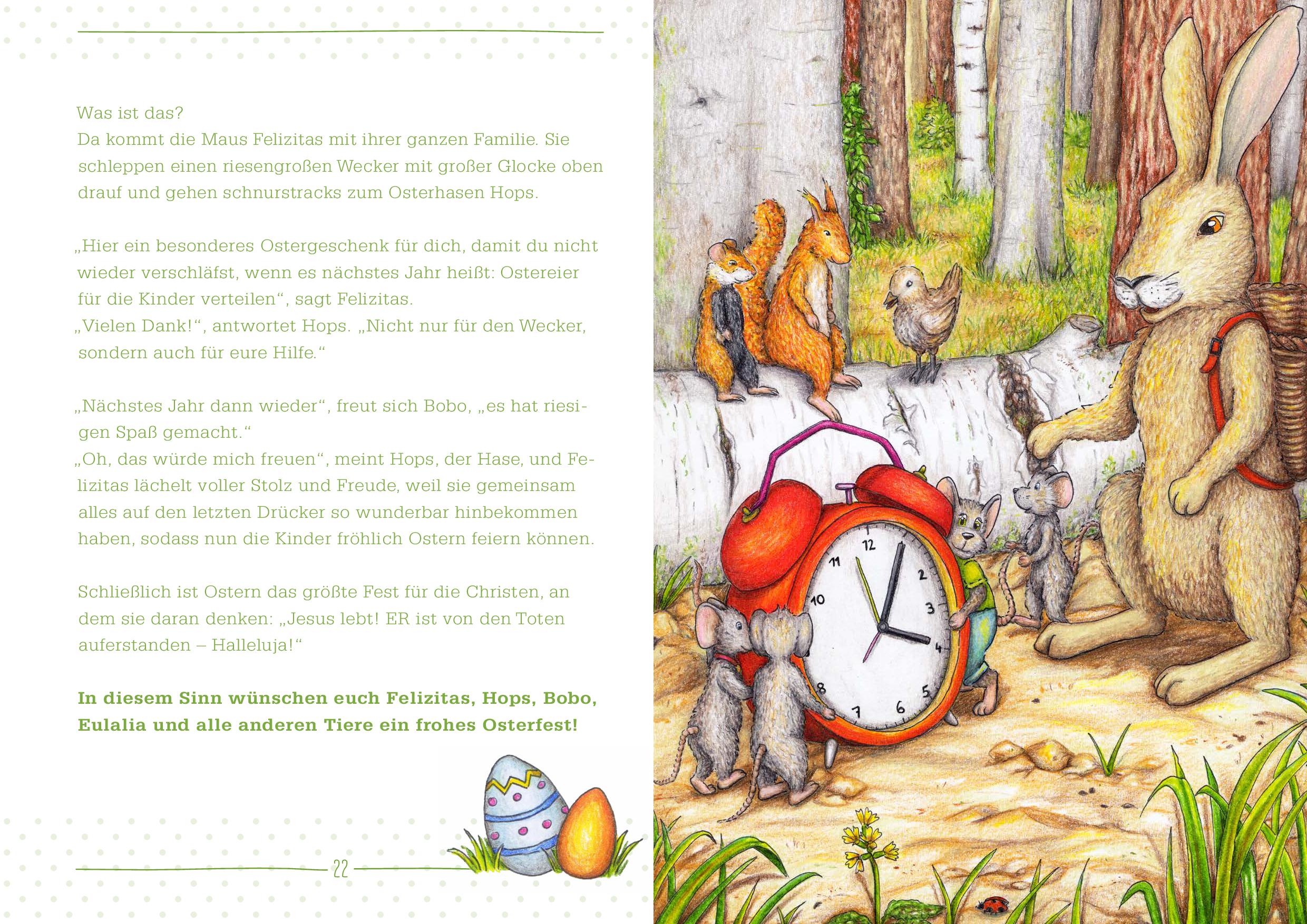 Felizitas versteht nicht, warum die Kinder bunte Ostereier bekommen sollen. So macht sie sich auf den Weg, um alle Tiere zu fragen, was hinter diesen bunten Eiern steckt. Die Tiere haben wenig Ideen. Nur die Eule Eulalia weiß, warum Eier verschenkt werden und erklärt den Tieren das Geheimnis von Ostern. Dann helfen alle zusammen, dass an Ostern die Kinder Ostereier suchen können. Und nicht nur die Kinder feiern Ostern, sondern auch alle Tiere gemeinsam mit Felizitas.