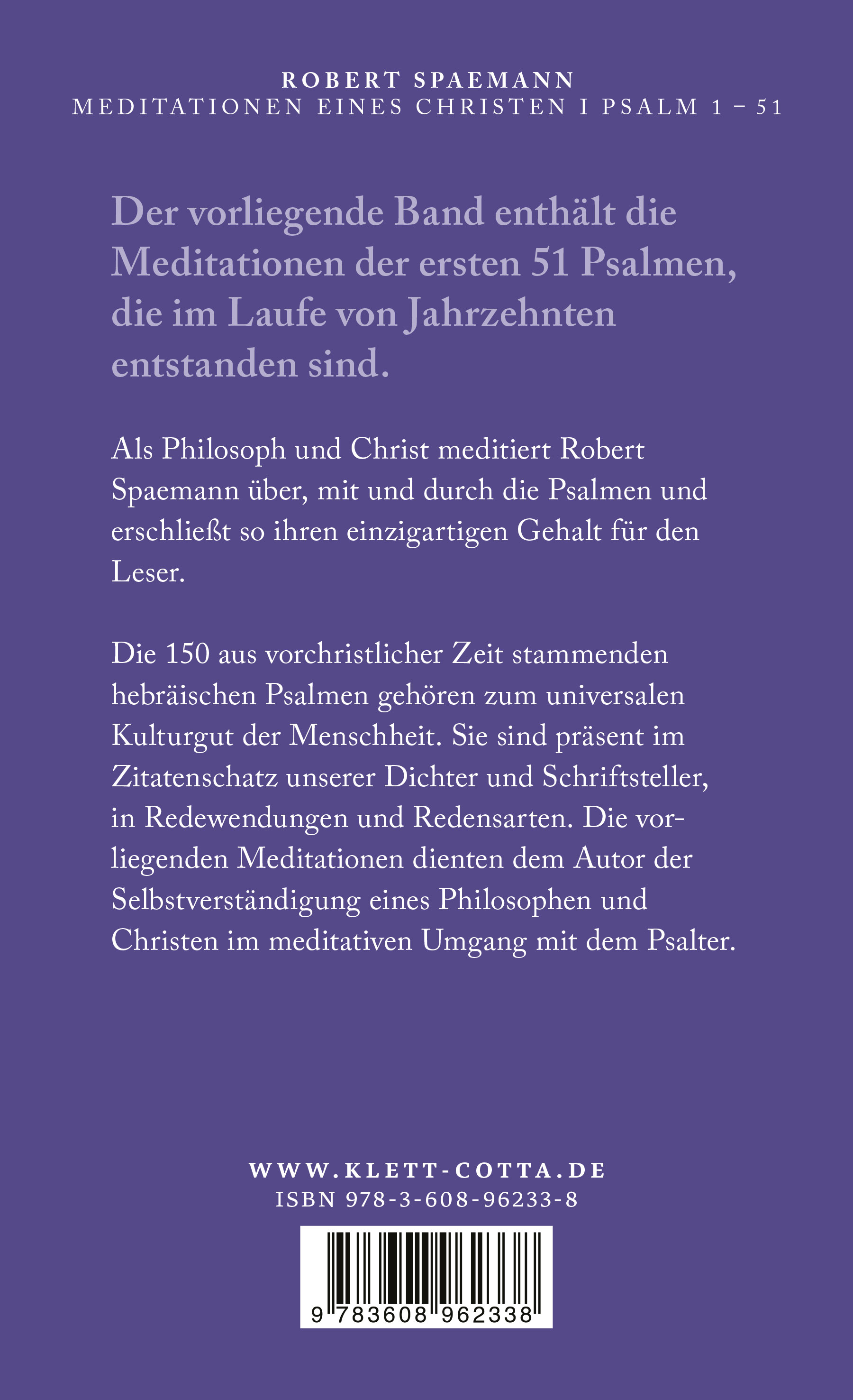 Der vorliegende Band enthält die Meditationen der ersten 51 biblischen Psalmen, die im Laufe von Jahrzehnten entstanden sind. Als Philosoph und Christ meditiert Robert Spaemann über, mit und durch die Psalmen und erschließt so ihren wertvollen Gehalt für den Leser.
