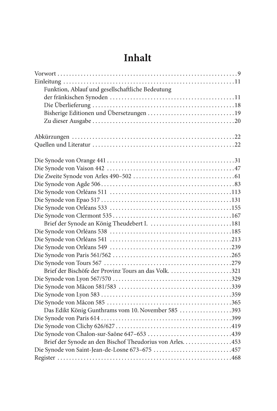 Vorwort 9Einleitung 11Funktion, Ablauf und gesellschaftliche Bedeutung der fränkischen Synoden 11Die Überlieferung 18Bisherige Editionen und Übersetzungen 19Zu dieser Ausgabe 20Abkürzungen 22Quellen und Literatur 22Die Synode von Orange 441 31Die Synode von Vaison 442 47Die Zweite Synode von Arles 490-502 61Die Synode von Agde 506 83Die Synode von Orléans 511 113Die Synode von Epao 517 131Die Synode von Orléans 533 155Die Synode von Clermont 535 167Brief der Synode an König Theudebert I. 181Die Synode von Orléans 538 185Die Synode von Orléans 541 213Die Synode von Orléans 549 239Die Synode von Paris 561/562 265Die Synode von Tours 567 279Brief der Bischöfe der Provinz Tours an das Volk. 321Die Synode von Lyon 567/570 329Die Synode von Mâcon 581/583 339Die Synode von Lyon 583 359Die Synode von Mâcon 585 365Das Edikt König Gunthrams vom 10. November 585 393Die Synode von Paris 614 399Die Synode von Clichy 626/627 419Die Synode von Chalon-sur-Saône 647-653 439Brief der Synode an den Bischof Theudorius von Arles. 453Die Synode von Saint-Jean-de-Losne 673-675 457Register 468