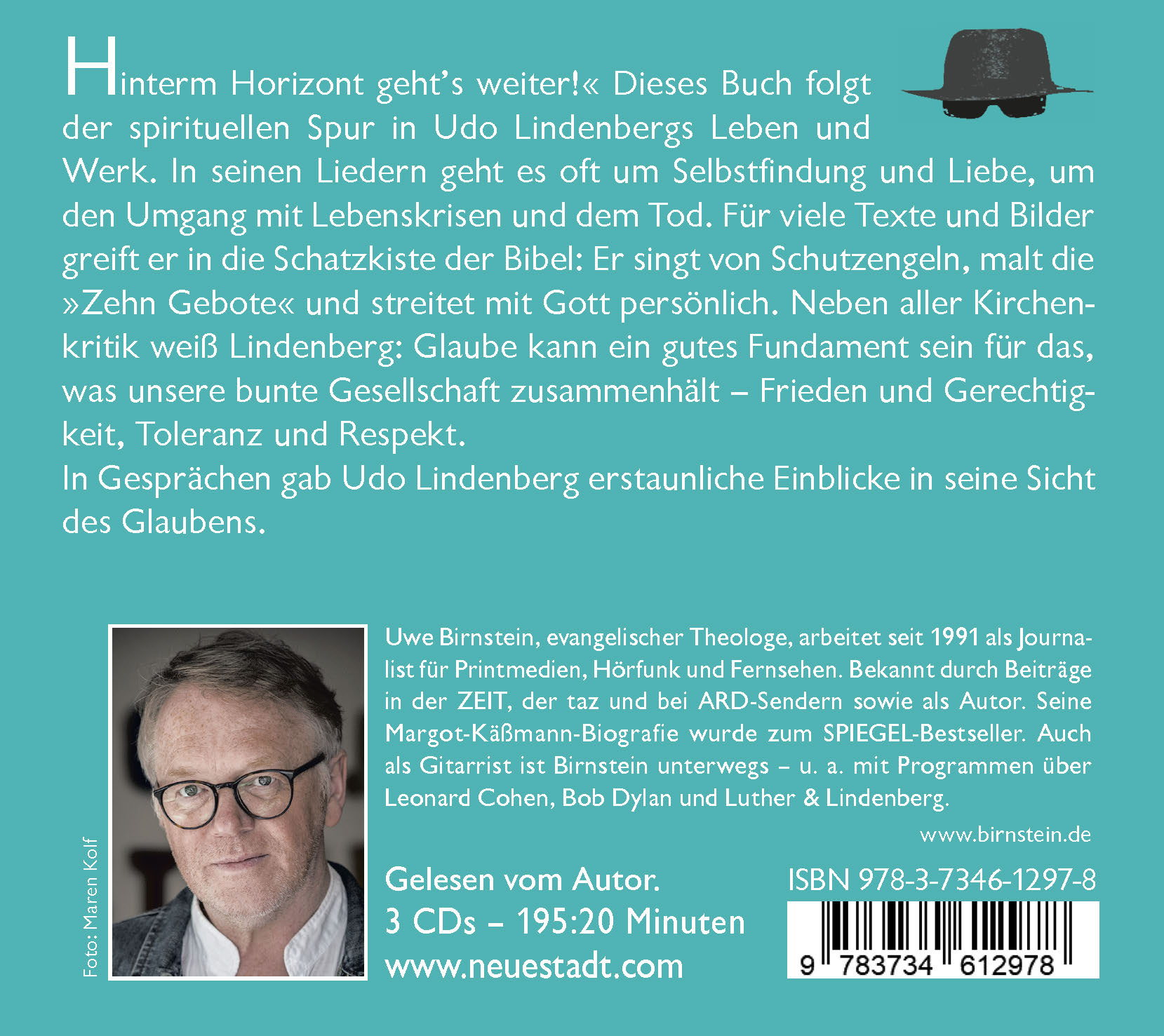 Gelesen vom Autor - 3 CDs - 195 Minuten»Hinterm Horizont geht's weiter!«Dieses Buch folgt der spirituellen Spur in Undo Lindenbergs Leben und Werk. In seinen Liedern geht es of um Selbstfindung und Liebe, um den Umgang mit Lebenskrisen und dem Tod. Für viele Texte und Bilder greift er in die Schatzkiste der Bibel: Er sing von Schutzengeln, malt die »Zehn Gebote« und streitet mit Gott persönlich. Neben aller Kirchenkritik weiß Lindenberg: Glaube kann ein gutes Fundament sein für das, was unsere bunte Gesellschaft zusammenhält - Frieden und gerechtigkeit, Toleranz und Respekt.In Gesprächen gab Udo Lindenberg erstaunliche Einblicke in seine Sicht des Glaubens.Uwe Birnstein evangelischer Theologe, arbeitet seit 1991 als Journalist für Printmedien, Hörfunk und Fernsehen. Bekannt durch Beiträge in der ZEIT, der taz und bei ARD-Sendern sowie als Autor. Seine Margot-Käßmann-Biografie wurde zum SPIEGEL-Bestseller. Auch als Gitarrist ist Birnstein unterwegs - u.a. mit Programmen über Leonard Cohen, Bob Dylan und Luther & Lindenberg.