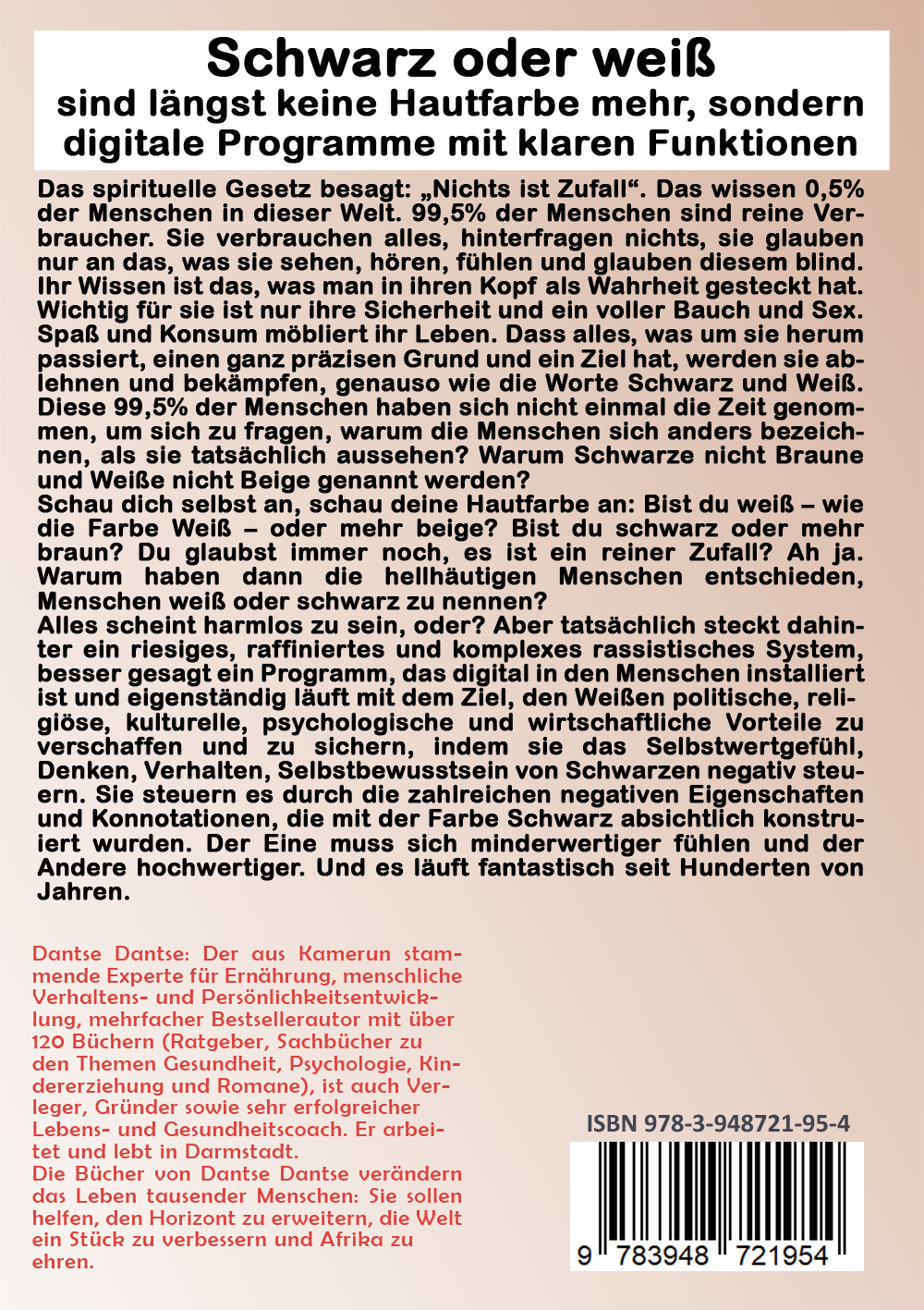 Dantse Dantse: Lieber Neger als Schwarzer: Die Kreation einer "minderwertigen Rasse" durch WeißeGott erschuf den Menschen nach seinem Ebenbild und die Weißen erschufen die Schwarzen nach ihrer Vorstellung: Das stille und vielleicht größte Verbrechen aller Zeiten war es, Menschen schwarz zu nennen.Schwarz oder Weiß sind längst keine Hautfarben mehr, sondern digitale Programme mit klaren Funktionen.Schwarz und Weiß ist kein Zufall. Das ist ein rassistisches Programm. Ein Wort, Schwarz, bestimmt seit Hunderten von Jahren negativ das Leben von Milliarden von Menschen (Schwarzen) und regelt das Verhalten der Weißen zu den Schwarzen und umgekehrt. Das spirituelle und weise Gesetz besagt: "Nichts ist Zufall, nicht mal ein Gedanke". Das wissen 0,5% der Menschen auf dieser Welt. 99,5% der Menschen sind reine Verbraucher. Sie verbrauchen alles, hinterfragen nichts, sie glauben nur an das, was sie sehen, hören, fühlen und glauben diesem blind. Ihr Wissen ist das, was man in ihren Kopf als Wahrheit gesteckt hat. Wichtig für sie ist nur ihre Sicherheit und ein voller Bauch und Sex. Spaß und Konsum möbliert ihr Leben. Dass alles, was um sie herum passiert, hat einen ganz präzisen Grund und ein Ziel, welches sie ablehnen und bekämpfen werden, genauso wie die Worte Schwarz und Weiß. Diese 99,5% der Menschen haben sich nicht mal die Zeit genommen, um sich zu fragen, warum die Menschen sich anders bezeichnen als sie tatsächlich aussehen? Warum Schwarze nicht Braune und Weiße nicht Beige genannt werden? Schau dich selbst an, schau deine Hautfarbe an: Bist du weiß - wie die Farbe Weiß - oder mehr beige? Bist du schwarz oder mehr braun? Du glaubst immer noch, dass es reiner Zufall ist? Ah ja. Warum haben dann die hellhäutigen Menschen entschieden, Menschen Weiß oder Schwarz zu nennen?Alles scheint harmlos zu sein, oder? Aber tatsächlich steckt dahinter ein riesiges, raffiniertes und komplexes rassistisches System, besser gesagt Programm, das digital in den Menschen installiert ist und eigenständig läuft mit dem Ziel, Weißen politische, religiöse, kulturelle, psychologische und wirtschaftliche Vorteile zu verschaffen und zu sichern, indem sie das Selbstwertgefühl, Denken, Verhalten, Selbstbewusstsein von Schwarzen negativ steuern. Sie steuern es durch die zahlreichen negativen Eigenschaften und Konnotationen, die mit der Farbe Schwarz absichtlich konstruiert wurden. Der Eine muss sich minderwertiger fühlen und der Andere hochwertiger. Und es läuft fantastisch seit Hunderten von Jahren. Sich Schwarz zu nennen, was in der Bibel Finsternis, Reich des Teufels bedeutet, heißt auch, Gott den Schöpfer verraten zu haben.Schwarz oder weiß sind längst keine Hautfarben mehr, sondern digitale rassistische Programme mit klaren Funktionen, die die Beziehung zwischen den Menschen seit Hunderten von Jahren diktieren mit vielen Vorteilen für die Weißen und Nachteilen für die Schwarzen, und das "dumme*" Volk bekommt es, wie so oft, nicht mit.*Es ist keine Beleidigung. Ich möchte nur ausdrücken, wie oft das Volk manipuliert wird, ohne, dass es dies mitbekommt.Willst du wirklich Schwarz sein und es bleiben? Lies dieses Buch und du wirst nie wieder dieses Wort hören wollen.Die, die sich weiß genannt haben, sind eher beige und haben nichts mit der Farbe Weiß zu tun. Die, die von den Weißen als Schwarz bezeichnet werden, sind eher braun. Diese Tatsache ist offensichtlich. Dennoch nutzten sie diese falschen Farben, um Menschen zu bezeichnen. Was auf den ersten Blick heute normal erscheint, ist eine bewusste Programmierung, die auf die Eigenschaften dieser beiden Wörter Schwarz und Weiß zurückzuführen ist, wie du in diesem Buch entdecken wirst.Der Titel "Lieber Neger als Schwarzer" ist Programm. Dass ich mich lieber Neger nennen will als Schwarzer, reicht aus, damit die Leser:innen wissen, dass Schwarz noch schlimmer sein muss, als alle bewusst denken. Klar lehne ich das Wort Neger ab. Ich spiele mit dem Wort, um Menschen bewusst zu machen, was sie sich