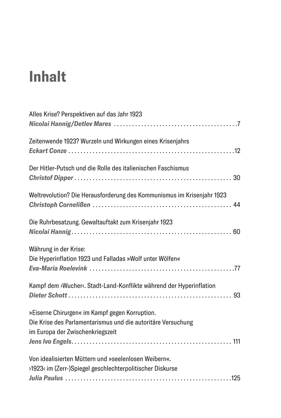 Hundert Jahre später scheinen sich die Krisen abermals zu häufen. Höchste Zeit, das Krisenjahr 1923 einzuordnen, das Krisennarrativ überwinden und den Blick zu weiten. In historischen Büchern über die deutsche Geschichte und die Geschichte Europas werden die Entwicklungen von vor hundert Jahren oft als unausweichlich beschrieben. In den Beiträgen von Autoren wie Eckart Conze, Christoph Cornelißen, Franziska Davies, Christof Dipper, Gerrit Schenk und Jens Ivo Engels erhalten Sie einen neuen Blick auf die Herausforderungen, denen sich damals nicht nur die erste deutsche Demokratie stellen musste.
