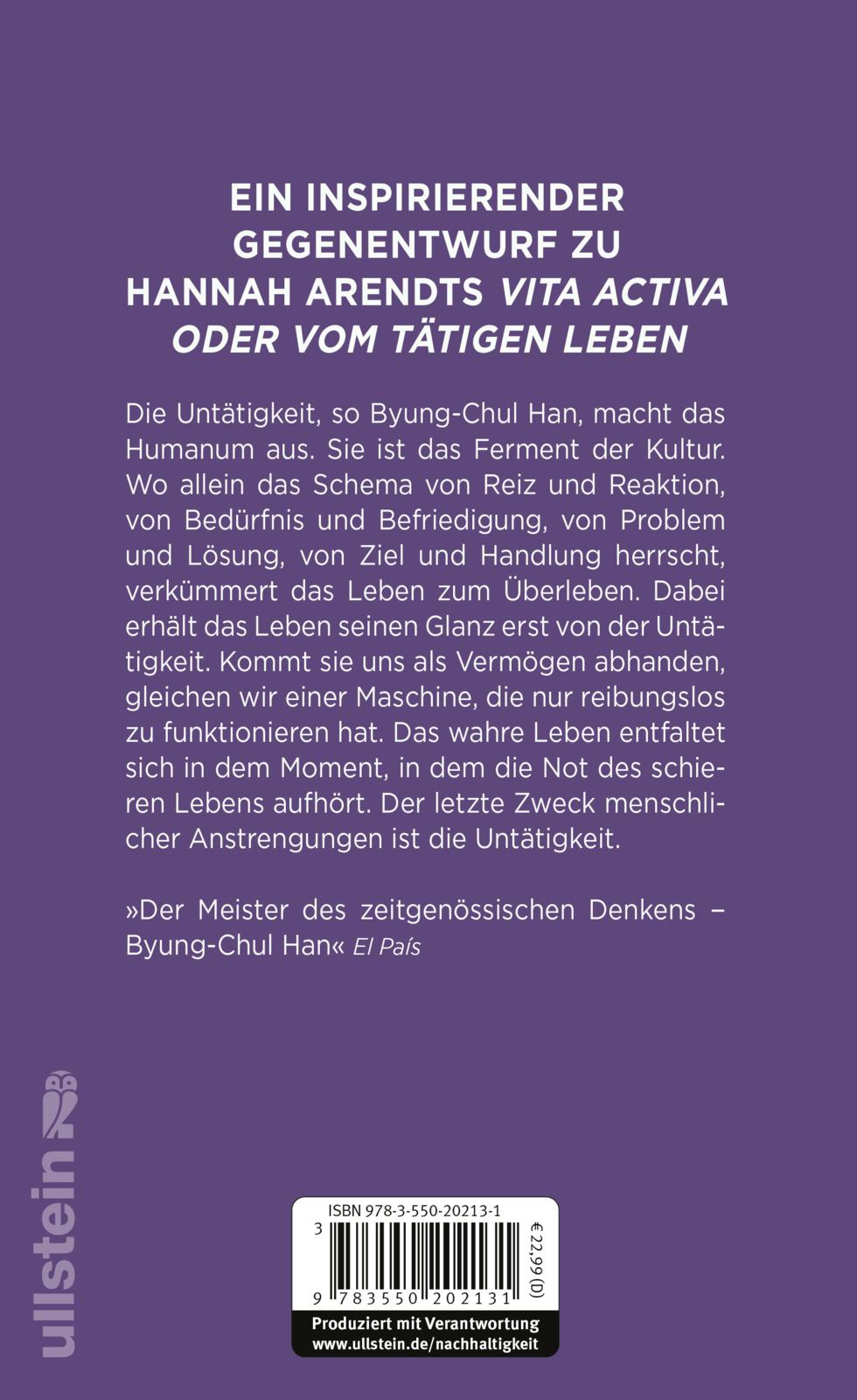 Die Fähigkeit zur Untätigkeit kommt uns gänzlich abhanden. Dabei ist Untätigkeit keine Negation, keine Verweigerung, keine bloße Abwesenheit von Tätigkeit, sondern ein eigenständiges Vermögen. Byung-Chul Han spürt dem Reichtum, der Pracht und der Magie der Untätigkeit nach und entwirft eine neue Lebensform.
