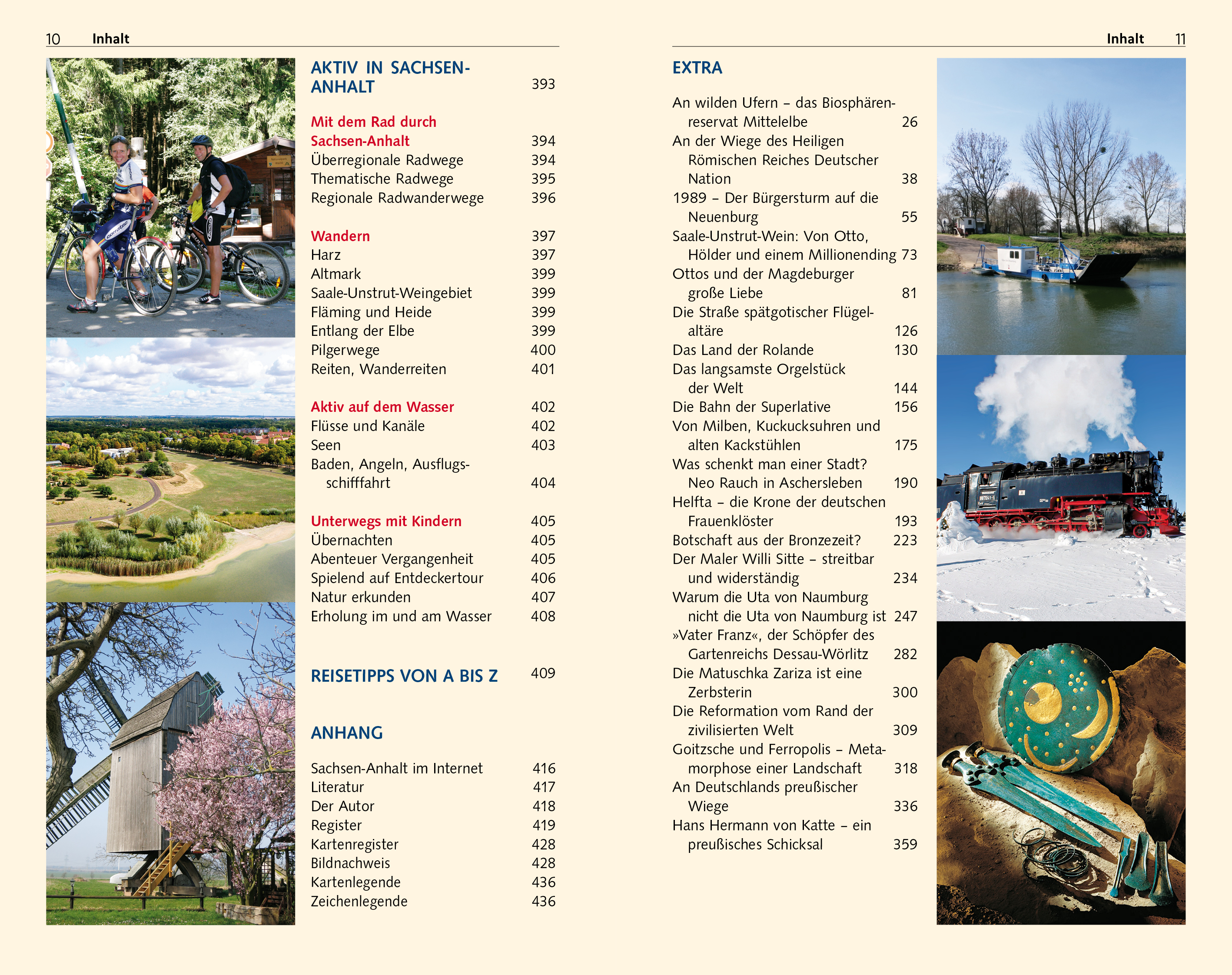 Vorwort: Eine »Gebrauchsanweisung« für das Land 13Das Wichtigste in Kürze 14Herausragende Sehenswürdigkeiten 16LAND UND LEUTE 19Zahlen und Fakten 20Geografie 21Gewässer 23Schutzgebiete 24Bevölkerung 27Wirtschaft und Gesellschaft 28Bergbau 30Chemie 31Maschinenbau 31Land- und Ernährungsgüterwirtschaft 32Sport 33Geschichte 35Von der Frühzeit bis zum Mittelalter 35Die Ottonen 36Das Magdeburger Recht und der Sachsenspiegel 36Askanier, Luxemburger, Wettiner 37Von der Reformation bis zum Wiener Kongress 39Anhalt und Preußische Provinz Sachsen 4120. und 21. Jahrhundert 42Sachsen-Anhalts Geburt und DDR-Zeit 44Sachsen-Anhalts Wiedergeburt 45Berühmte Persönlichkeiten 47Kunst und Kultur 56Musik, Theater, Film 56Architektur 58Bildende Kunst 61Feste, Traditionen und Festivals 62Die Mitte - Feste in Magdeburg, an der Elbe, in Börde und Heide 62Der Westen - Feste in Harz und Harzvorland 63Der Süden - Feste in Halle und der Saale-Unstrut-Region 64Der Osten - Feste in Anhalt und Wittenberg 65Der Norden - Feste in der Altmark 66Essen und Trinken 67Die Altmark: Nichts geht ohne Hochzeitssuppe 67Anhalt: Küche zwischen »Himmel und Erde« 68Der Süden: Thüringer Küche und lebendiger Käse 69Harzer Roller - und dazu Kakao 71Die Börde: Bötel, Bollen, Prilleken 71DIE _MITTE - MAGDEBURG, ELBE, _BÖRDE, _HEIDE 75Magdeburg 77Altstadt mit Dom und Domviertel 78Zwischen Altem Markt und Elbe 83Südliche Altstadt 87Westliche Altstadt 90Vom Breiten Weg zu Campus und Elbe 92An der Elbe von Nord nach Süd 94Entdeckungen außerhalb des Zentrums 98Börde und Heide 105Wolmirstedt 105Colbitz-Letzlinger Heide 106Haldensleben 106Um den Flechtinger Höhenzug 109Oschersleben und die südliche Börde 111Jerichower Land 115Burg 115Jerichow 118Genthin und Umgebung 120Möckern und Umgebung 122Gommern und Umgebung 123Das Salzland 127Schönebeck (Elbe) 127Der Elbe-Saale-Winkel 128Staßfurt und Umgebung 133DER _WESTEN - OSTHARZ UND _HARZVORLAND 137Entdeckerland um den Brocken 139Halberstadt 139Domplatz 140Altstadt 143Spiegelsberge 145Langenstein 145Rund um Huy und Fallstein 145Osterwieck 147Blankenburg (Harz) 149Rund um Blankenburg 150Thale 153Bodetal und Umgebung 153Wernigerode 158Altstadt 158Schloss Wernigerode 160Rund um Wernigerode 161Ilsenburg 165Kloster Drübeck 165Quedlinburg 167Ein Altstadtrundgang 167Der Schlossberg 169Gernrode 172Bad Suderode 173Links und rechts der Harz-Hochstraße 176Zwischen Mansfeld und Güntersberge 176Stadt Oberharz am Brocken 178Das Harzvorland um Aschersleben 183Aschersleben 183Ballenstedt und Umgebung 186Mansfelder Land und Südharz 191Lutherstadt Eisleben 191Mansfeld-Lutherstadt 194Hettstedt 195Sangerhausen 197Rund um Sangerhausen 198Stolberg (Harz) 202DER SÜDEN - HALLE UND DIE_ SAALE-UNSTRUT-REGION 205Lebendiges Geschichtsbuch 206Halle (Saale) 207Geschichte 207Die Innenstadt 209Am und um den Ring 212An der Saale und um den Giebichenstein 217Rund um Halle 225Naturpark Unteres Saaletal 225Merseburg und Umgebung 229Dom St. Johannes und Laurentius 229Schloss und Schlossgarten 231Ständehaus 231Vom Domberg in die Stadt 232Bad Dürrenberg 235Der Geiseltalsee und Mücheln 236Goethestadt Bad Lauchstädt 238Querfurt 240Das Burgenland und die Weinregion Saale-Unstrut 242Naumburg 243Kloster Pforta, Bad Kösen, Bad Bibra 250Freyburg (Unstrut) 254Goseck 256Die Unstrut aufwärts von Freyburg bis Memleben 258We