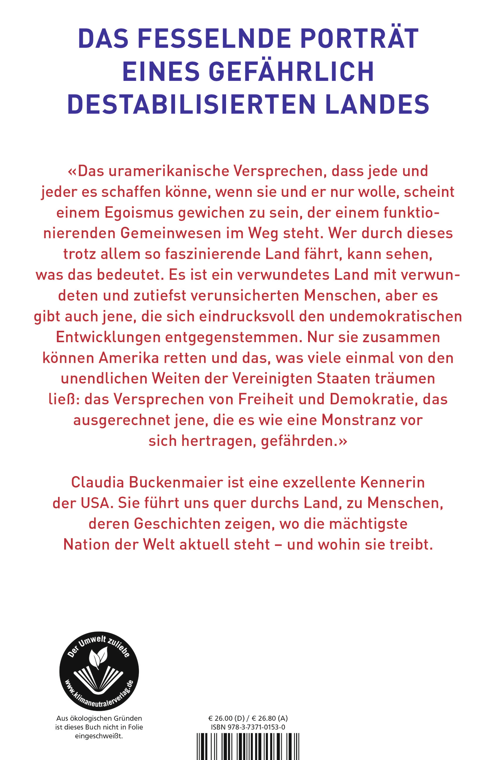 Claudia Buckenmaier, bis 2022 Korrespondentin und Leiterin des ARD-Studios in Washington, ist eine ausgewiesene Kennerin Amerikas. Reportagereisen haben sie quer durch das Land geführt, zu Menschen, deren Geschichten zeigen, wo die USA heute stehen. Darunter ein hispanischer Sheriff einer texanischen Grenzstadt, der das Versagen der amerikanischen Einwanderungspolitik täglich miterlebt; ein Pastor aus Ohio, der mitansehen muss, wie seine Gemeinde immer extremeren Verschwörungstheorien verfällt; ein demokratischer Abgeordneter, der im Sitzungssaal war, als das Kapitol von einem wütenden Mob gestürmt wurde. In ihrem Buch fühlt Buckenmaier der mächtigsten Nation der Welt den Puls: Gibt es Hoffnung auf Versöhnung, oder ist Amerika dabei, sich selbst zu verlieren? Und was bedeutet das für uns? Das ebenso persönliche wie scharfsichtige Porträt eines gefährlich destabilisierten Landes.