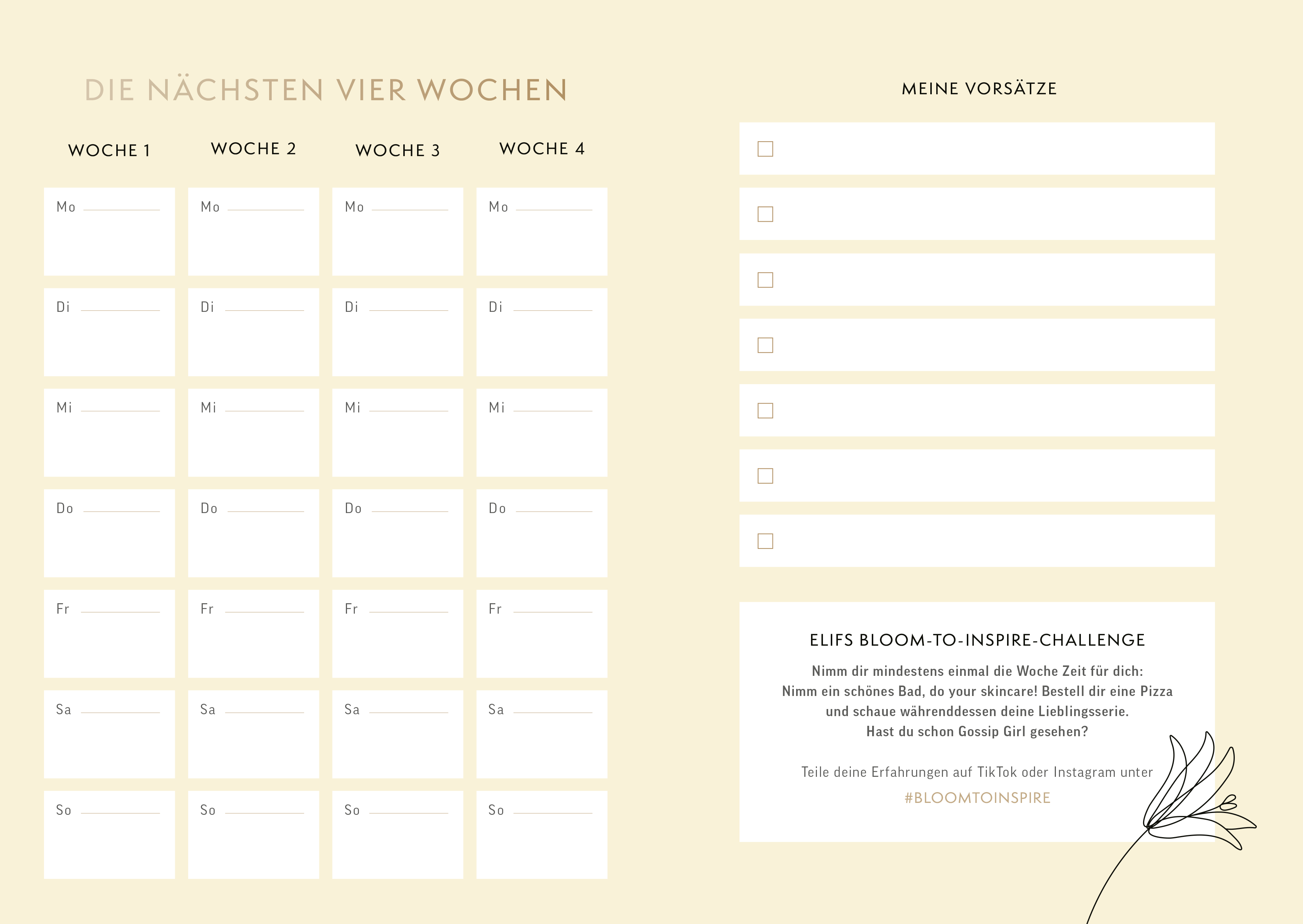 Elif-Sima Bayrak ist Content Creatorin und Sängerin. Sie liebt es, auf Social Media aktiv zu sein und ihre Community zu inspirieren. Schon als Kind hat Elif gesungen und eigene Songtexte geschrieben. Ihre Leidenschaft für die Musik hat sie nie verloren, weswegen sie inzwischen eigene Songs veröffentlicht. Ohne To-Do-Listen läuft bei der Studentin gar nichts. Deswegen veröffentlicht sie mit „Bloom to Inspire“ ihren perfekten Planer für mehr Struktur und Achtsamkeit im Alltag.