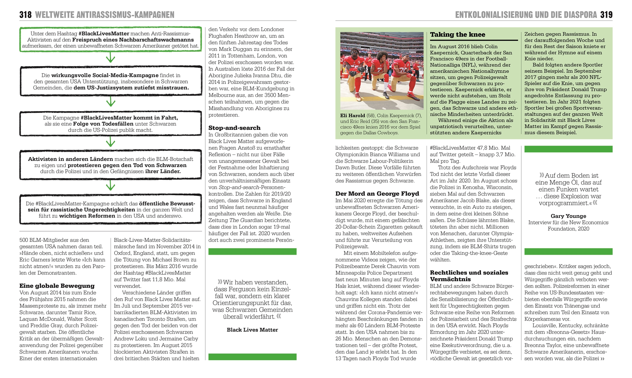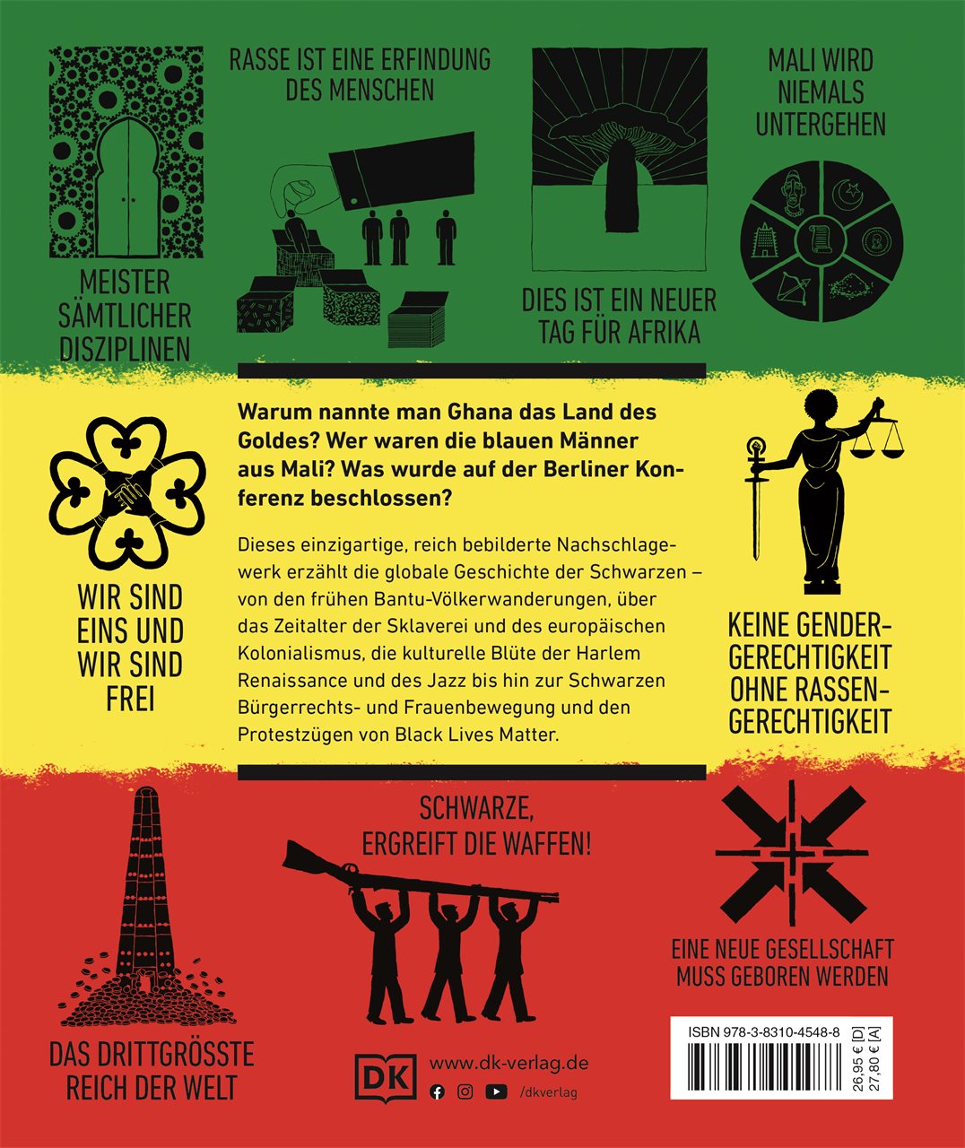 | Schlagworte | Alice Walker • Anti-Apartheid • Apartheid • Atlantischer Sklavenhandel • barack obama • Benin-Bronzen • Berliner Kongo-Konferenz • Big Ideas einfach erklärt • Black-History-Buch • Black lives matter • Black Power Movement • Busboykott • Dekolonialisierung • Djenné • George Floyd • Great Zimbabwe • Harlem Renaissance • Herero und Nama-Aufstand • Jazz • Kolonialismus • Kolonien • Malcolm X • Marsch nach Washington • Martin Luther King • Mau-Mau-Krieg • Miriam Makeba • Montgomery Bus-Boykott • Nelson Mandela • Rasse • Rastafari • Ruanda, Genozid • Sklavenhandel • Sklaverei • Trans-Sahara-Sklavenhandel • Unruhen von Brixton • Völkermord • Yes, we can • Zulu-Empire |