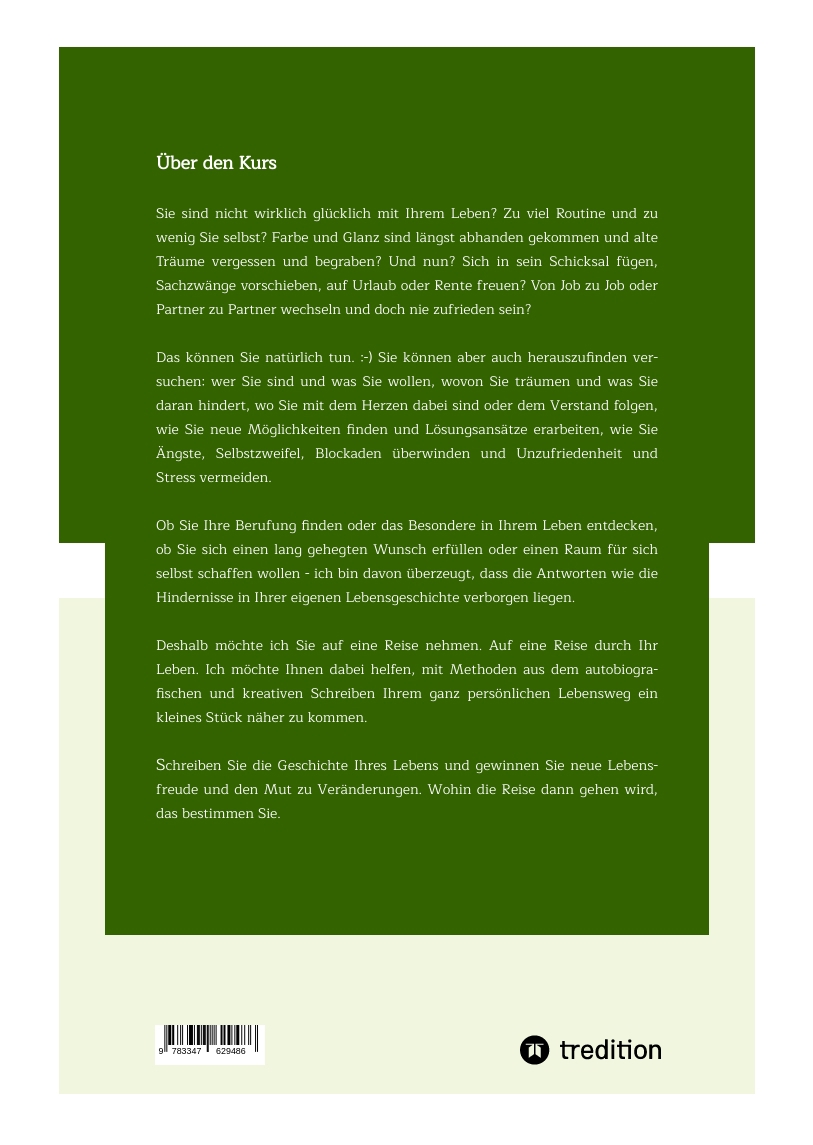 | Schlagworte | Berufung • Berufung finden • Bestimmung • Bestimmung finden • Buch • Coaching • eBook • E-Book • eigenes Leben • Erfülltes Leben • erfülltes Leben führen • Erfüllung im Leben • Glück • Glück im Leben • Glücklich • glückliches Leben • Glücklich sein • glücklich werden • Hilfe • Kurs • Leben • Leben gestalten • Lebensgeschichte • Lebensgestaltung • Lebensglück • Lebenshilfe • lebensplatz • Lebenstraum • Lebensträume • Lebensträume erfüllen • Lebenstraum erfüllen • Lebenswunsch • Lebenswünsche • Lebenswünsche erfüllen • lebenswunsch erfüllen • Lebenszufriedenheit • Lifecoaching • mein leben selbst gestalten • Persönlichkeitsentwicklung • Platz im Leben • Platz im Leben finden • Potenzial • potenzial im leben • potenzial leben • Ratgeber • Schreiben • Selbstbestimmtes Leben • Selbstcoaching • Selbsterkenntnis • Selbstfindung • Selbstlernkurs • Selfcare • Seminar • sich besser verstehen • sich finden • sich selbst erkennen • sich selbst finden • sich selbst kennenlernen • sich selbst verstehen • sich verändern • sich verstehen • Traum • Träume • Träume erfüllen • Träume leben • Traum erfüllen • Verändern • Veränderung • Veränderungen • was kann ich • was macht mich glücklich • was will ich • wer bin ich • wie kann ich ein eigenes leben führen • wie kann ich ein erfülltes leben führen • wie kann ich ein glückliches leben führen • wie kann ich ein selbstbestimmtes leben führen • wie kann ich ein zufriedenes leben führen • wie kann ich glücklich werden • wie kann ich herausfinden, was ich kann • wie kann ich herausfinden, was ich will • wie kann ich herausfinden, was mich glücklich macht • wie kann ich herausfinden, wer ich bin • wie kann ich herausfinden, wovon ich träume • wie kann ich meine berufung finden • wie kann ich meine bestimmung finden • wie kann ich meinen platz im leben finden • wie kann ich mein leben gestalten • wie kann ich mein leben selbst gestalten • wie kann ich mein potenzial leben • wie kann ich mich besser kennenlernen • wie kann ich mich besser verstehen • wie kann ich mich selbst finden • Workshop • wovon träume ich • Wunsch • Wünsche • Wünsche erfüllen • wünsche leben • Wunsch erfüllen • zufrieden • zufriedenes Leben • Zufriedenheit • Zufriedenheit im Leben |