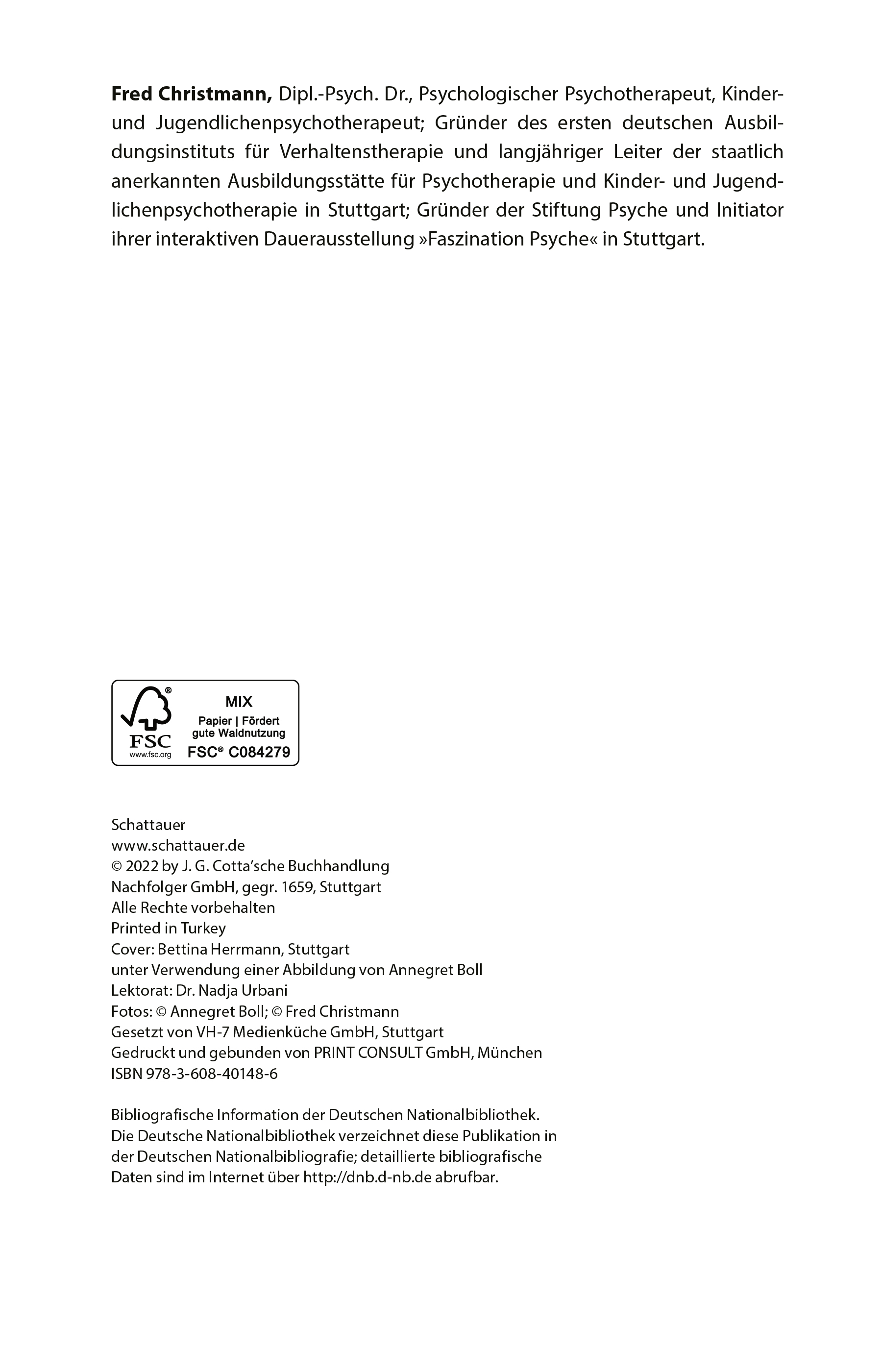 Fred Christmann, Dipl.-Psych. Dr., Psychologischer Psychotherapeut, Kinder- und Jugendlichenpsychotherapeut; Gründer des ersten deutschen Ausbildungsinstituts für Verhaltenstherapie und langjähriger Leiter der staatlich anerkannten Ausbildungsstätte für Psychotherapie und Kinder- und Jugendlichenpsychotherapie in Stuttgart; Initiator der Stiftung Psyche in Stuttgart.