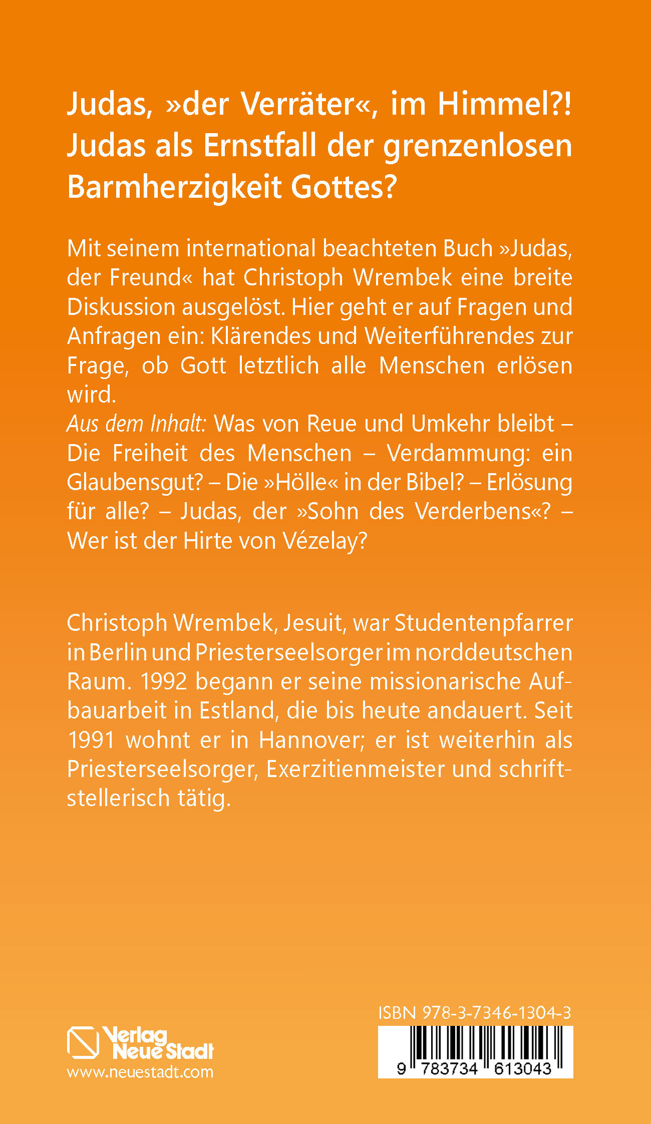 „Für manche Leser war es eine Zumutung, als Jesuiten-Pater Christoph Wrembek in einem Bestseller ausgerechnet Judas einen Freund genannt hat. Es gab sachliche Einwände, aber auch polemische Angriffe. Auf die häufigsten Fragestellungen liefert der Autor in einem weiteren Buch prägnante Antworten. Dabei verdeutlicht Wrembek etwas, was eine Herausforderung für unseren Glauben und unser Denken bedeutet. Gottes Erlösung ist für alle gedacht. (…)