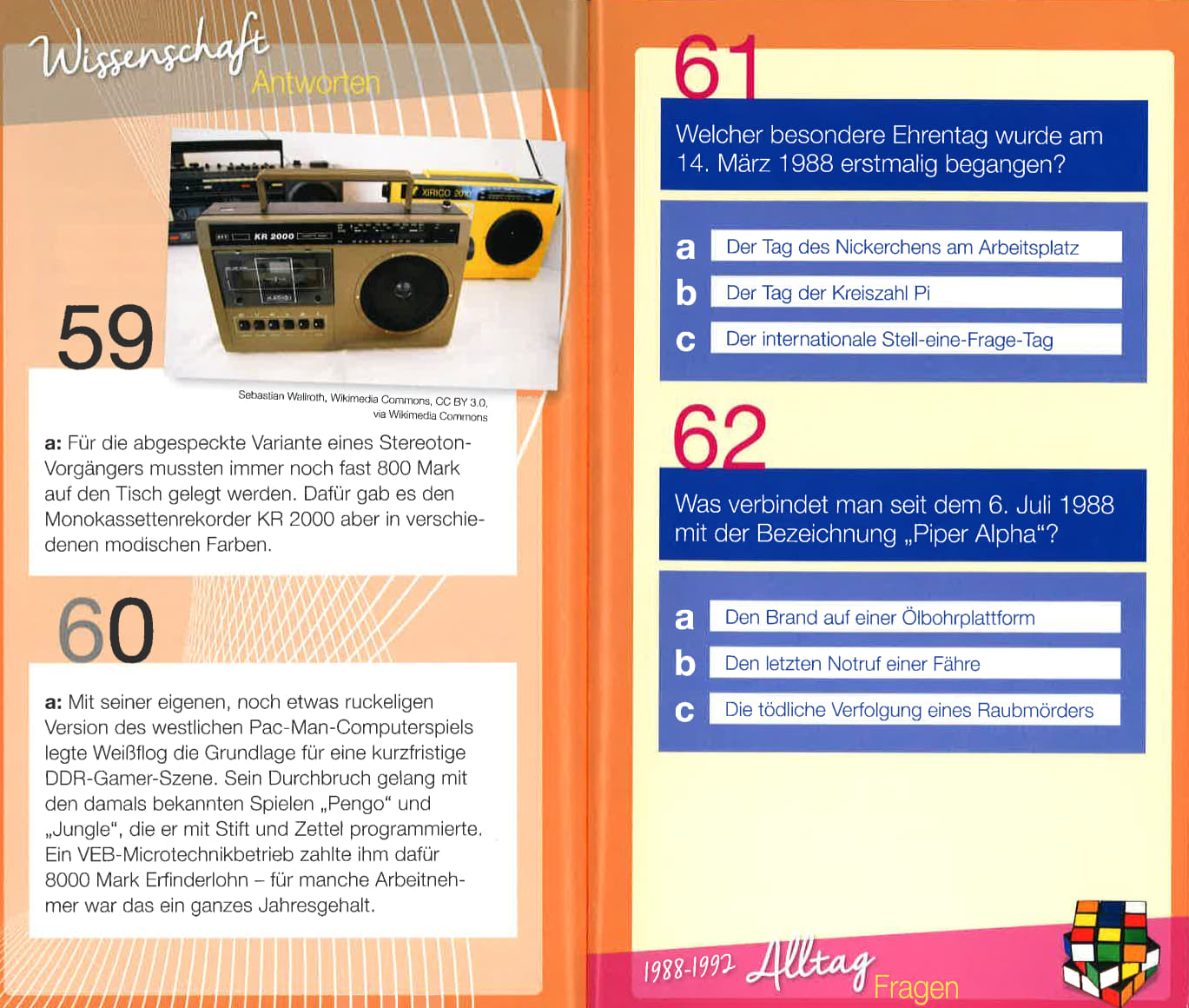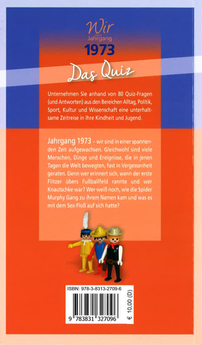 Jahrgang 1973 – wir sind in einer spannenden Zeit aufgewachsen. Gleichwohl sind viele Menschen, Dinge und Ereignisse, die in jenen Tagen die Welt bewegten, fast in Vergessenheit geraten. Denn wer erinnert sich, wann der erste Flitzer übers Fußballfeld rannte und wer Knautschke war? Wer weiß noch, wie die Spider Murphy Gang zu ihrem Namen kam und was es mit dem Sex-Floß auf sich hatte? Unternehmen Sie anhand von 80 Quiz-Fragen (und Antworten) aus den Bereichen Alltag, Politik, Sport, Kultur und Wissenschaft eine unterhaltsame Zeitreise in Ihre Kindheit und Jugend.