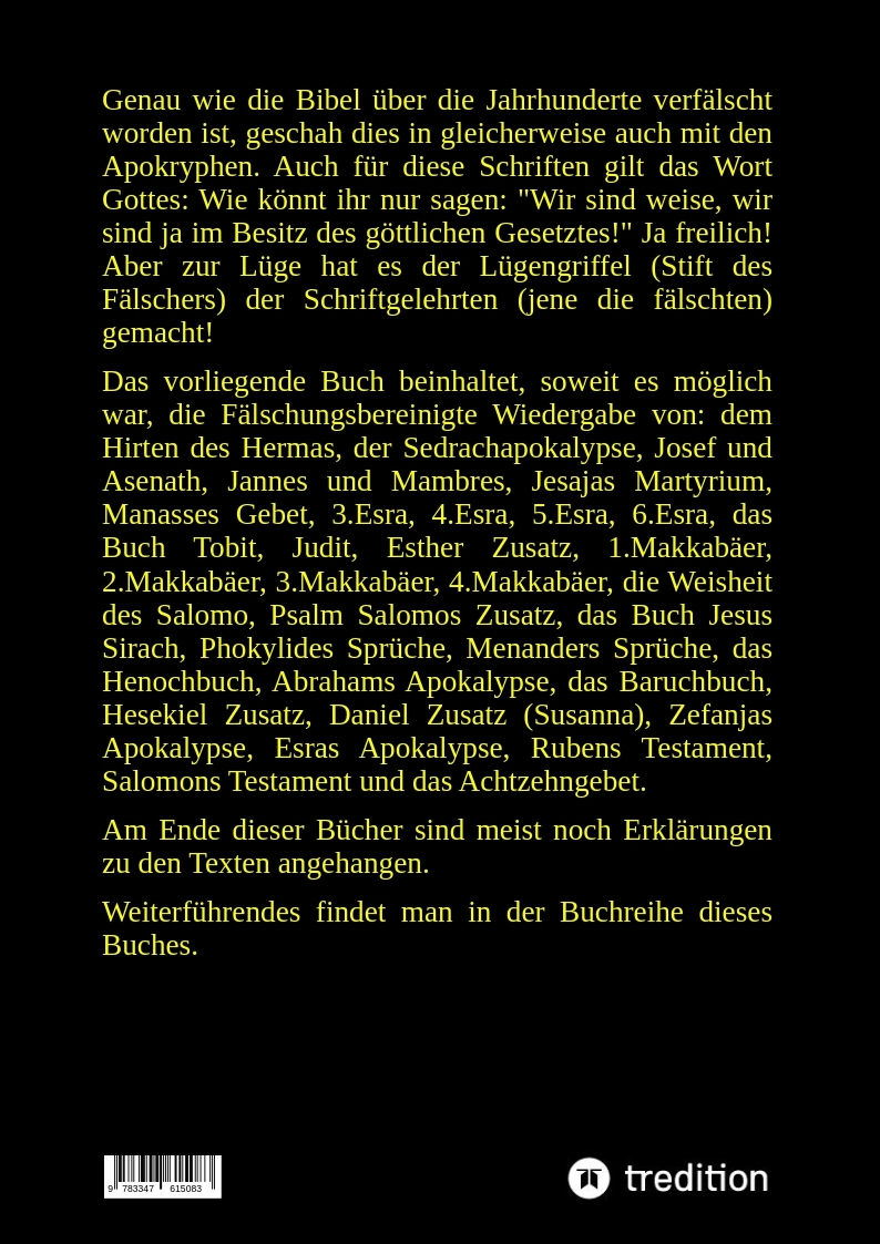 Genau wie die Bibel über die Jahrhunderte verfälscht worden, geschah dies auch mit den Apokryphen. Auch für diese Schriften gilt der Ausspruch Gottes: "Wie könnt ihr nur sagen: »Wir sind weise, wir sind ja im Besitz des göttlichen Gesetzes!« Ja freilich! Aber zur Lüge hat es der Lügengriffel (Stift des Fälschers) der Schriftgelehrten (jene die fälschten) gemacht. (Jeremia 8,8)Das vorliegende Buch beinhaltet die überarbeitete, bzw. soweit es ging die Fälschungsbereinigte Wiedergabe von nachstehenden Schriften:-Der Hirten des Hermas, -Die Sedrachapokalypse, -Josef und Asenath,-Jannes und Mambres,-Jesajas Martyrium, -Manasses Gebet, -3.Buch Esra, -4.Buch Esra, -5. Buch Esra, -6. Buch Esra,-Esras Vision,-Das Buch Tobit, -Judit, -Esther Zusatz, -1.Makkabäer, -2.Makkabäer, -3.Makkabäer, -4.Makkabäer, -Die Weisheit des Salomo, -Psalm Salomos Zusatz, -Das Buch Jesus Sirach, -Phokylides Sprüche,-Menanders Sprüche,-Das erste Henochbuch, -Abrahams Apokalypse,-Das Baruchbuch, -Hesekiel Zusatz, -Daniel Zusatz (Susanna), -Zefanjas Apokalypse, -Esras Apokalypse, -Rubes Testament,-Salomons Testament,-Das Achtzehngebet.Die Änderungen der Schriften werden am Ende des Textes erklärt und begründet.
