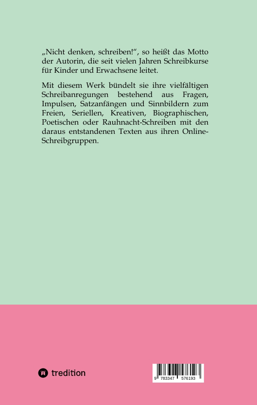 Das gemeinsame Schreiben mit Gleichgesinnten ist pure Freude, weckt Lebensgeister und verführt zu kreativen Hochflügen. Seit vielen Jahren gibt die Autorin Schreibkurse für Anfänger und Fortgeschrittene, wobei ihr Fokus auf dem Freien, Impulsiven Schreiben liegt. Seit zwei Jahren hat der Zulauf an Online-Schreibkursen zugenommen. In diesem Buch werden viele dieser wunderbaren Texte vorgestellt und die dazu gehörigen Impulse zum Schreiben. Es soll dazu anregen, selbst eine Schreibgruppe zu gründen und sich dort gegenseitig im kreativen Prozess zu begleiten.Einführung ins Freie SchreibenWas Schriftsteller brauchen Was Schriftsteller nicht brauchenImpulse, Satzanfänge, Sinnbilder, Fragen für das Gestalten eines eigenen SchreibworkshopsTexte aus den Schreibgruppen