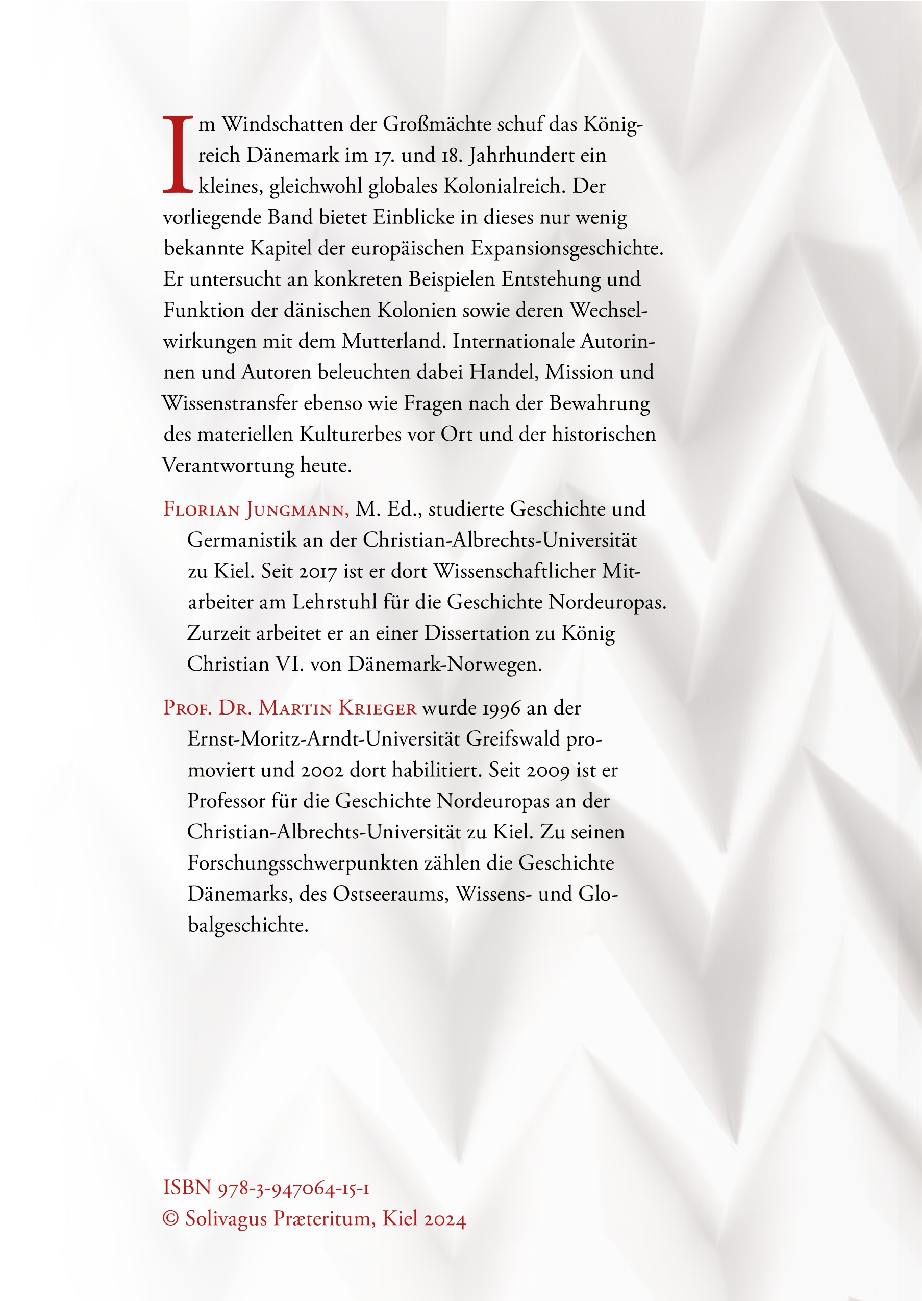 Florian Jungmann, M. Ed., studierte Geschichte und Germanistik an der Christian-Albrechts-Universität zu Kiel. Seit 2017 ist er dort Wissenschaftlicher Mitarbeiter am Lehrstuhl für die Geschichte Nordeuropas. Zurzeit arbeitet er an einer Dissertation zu König Christian VI. von Dänemark-Norwegen.