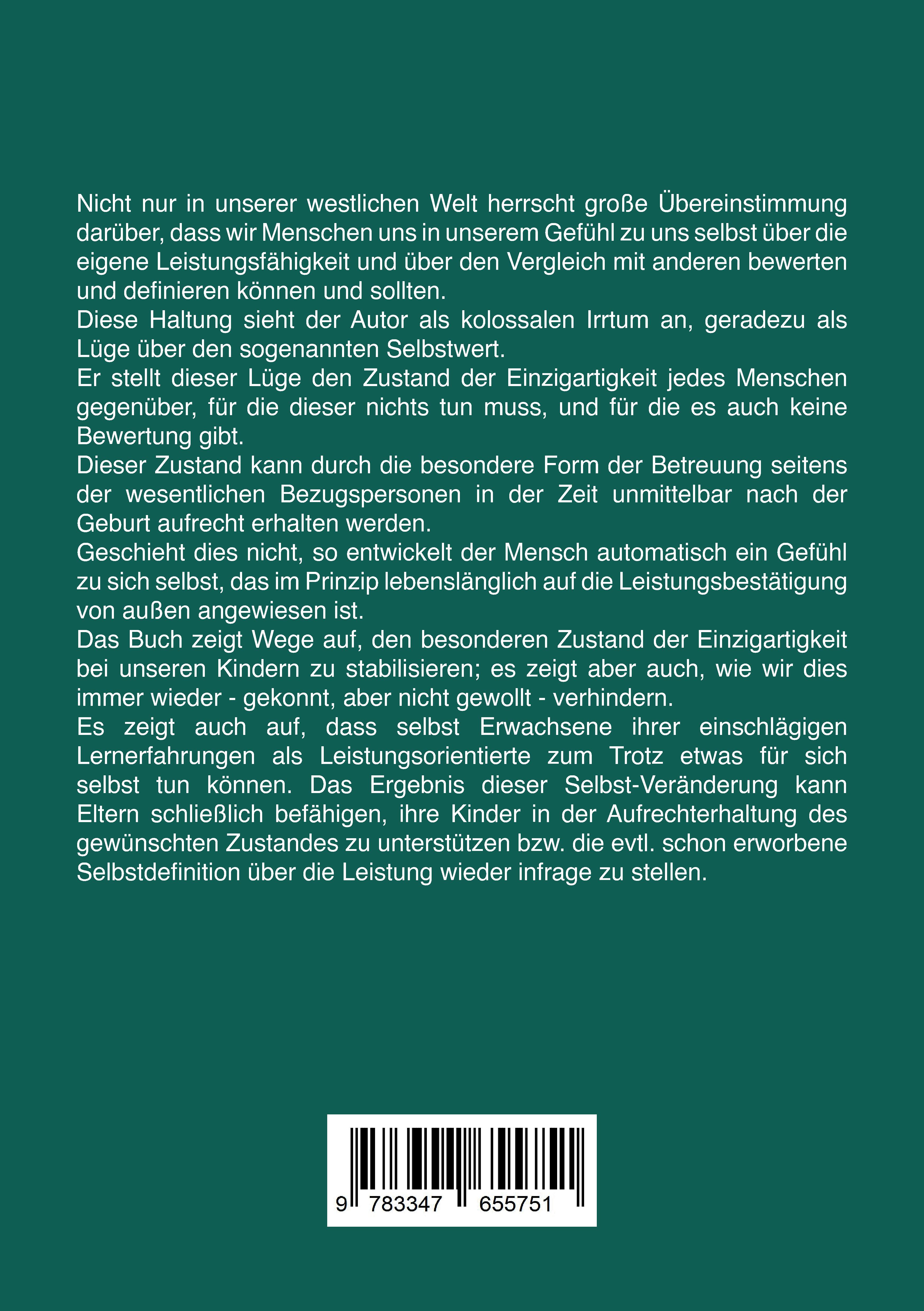 Wenn auf diesem Planeten ein Kind geboren wird, gerät es in eine konkrete Umgebung, von der es annehmen muss, dass sie die ganze Welt repräsentiert. Und daher wird es alles, was es erfährt, als richtig, stimmig und wahr erleben und auch glauben.Aber: Eine Wahrheit ist das nie! Jede Kultur, in die ein Kind hineingeboren wurde, hat sich im Laufe der Jahrtausende entwickelt. Und dabei sind zwangsläufig besondere Einstellungen, Haltungen, Vorstellungen von Moral und Ethik und Religion etc. entstanden. Und die Mitglieder dieser Gemeinschaften vertreten dies alles oft recht kritiklos.Aber noch einmal: All dies ist lediglich ein "Für-Wahr-Halten" innerhalb dieser besonderen Kultur. Aber keine allumfassende, für jeden Menschen gültige "Wahrheit".Warum habe ich dieses Buch geschrieben? In unserer Gesellschaft herrscht u.a. die kaum infrage gestellte Überzeugung, dass jeder Mensch sich selbst über seine Leistungen, seine Erfolge, sein Ansehen und sein Hab und Gut bewerten kann und darf. Das wird als allgemein gültige Wahrheit und Selbstverständlichkeit "verkauft".Allerdings wird dabei verschwiegen oder schlicht nicht wahrgenommen, dass Leistungen und Erfolge immer wieder erneut erarbeitet werden müssen. Denn die guten Gefühle über Anerkennung und Applaus versickern nach sehr kurzer Zeit schon wieder. Und das ewige Ackern-müssen macht oft sehr krank!Ich vertrete hingegen die Haltung, dass es unsinnig und gefährlich ist, einen Menschen über seine Leistungen - im weitesten Sinne - zu bewerten. Meine Erfahrung zeigt, dass eine solche Erwartungshaltung z.B. der Verunglimpfung, Abwertung und Verfolgung derer, die den zugrundeliegenden Ansprüchen und Ideologien irgendwie nicht genügen, Tür und Tor öffnet. Und diese Erfahrung trägt ebenfalls erheblich zu vielerart Krankheiten und psychischen Problemen bei.Dem gegenüber versuche ich die Einsicht zu vermitteln, dass jeder Mensch im Prinzip von Anfang an wertvoll und gleichwertig mit allen anderen Menschen dieses Planeten ist. Die Bewertung einer einzelnen Person ist daher völlig unsinnig. Bewertet kann allenfalls das Ergebnis eines Tuns. Welches mit der Person selbst nicht identisch ist! Eine solche Haltung erscheint mir definitiv angemessener und menschenwürdiger. Im Text zeige ich zunächst auf, welche Bedeutung schon die Schwangerschaft für die Stabilisierung des Zustandes der würdevollen Einzigartigkeit haben kann.Ich mache deutlich, dass wir unseren Kindern nach der Geburt zwar mit zumeist guten Absichten begegnen, viel zu oft aber mit unangemessenem Verhalten.Ich zeige schließlich auf, unter welchen Voraussetzungen es möglich wäre, diesen Urzustand der Einzigartigkeit aufrecht zu erhalten.Dabei sehe ich die "bedingungslose Liebe" als die wesentliche Grundvoraussetzung für ein diesbezügliches Gelingen an. Ich entwickle daraufhin Phantasien, wie sich ein solcherart geförderter Mensch in unserer Gesellschaft vermutlich verhalten und fühlen wird.Auf der anderen Seite stelle ich aber auch recht ausführlich dar, wie in unserer Gesellschaft die generelle Leistungsorientierung - hier Fremdwertgefühl genannt - entstehen kann, aufrecht erhalten wird und unsere Gefühle und unser Verhalten prägt.Schlussendlich zeige ich auf, was Erwachsene für sich selbst tun können, um sich von der Fremdwertgefühl-Falle etwas intensiver zu distanzieren und ihre Kinder somit unterstützen können, gar nicht erst in diese Falle hinein zu stolpern.