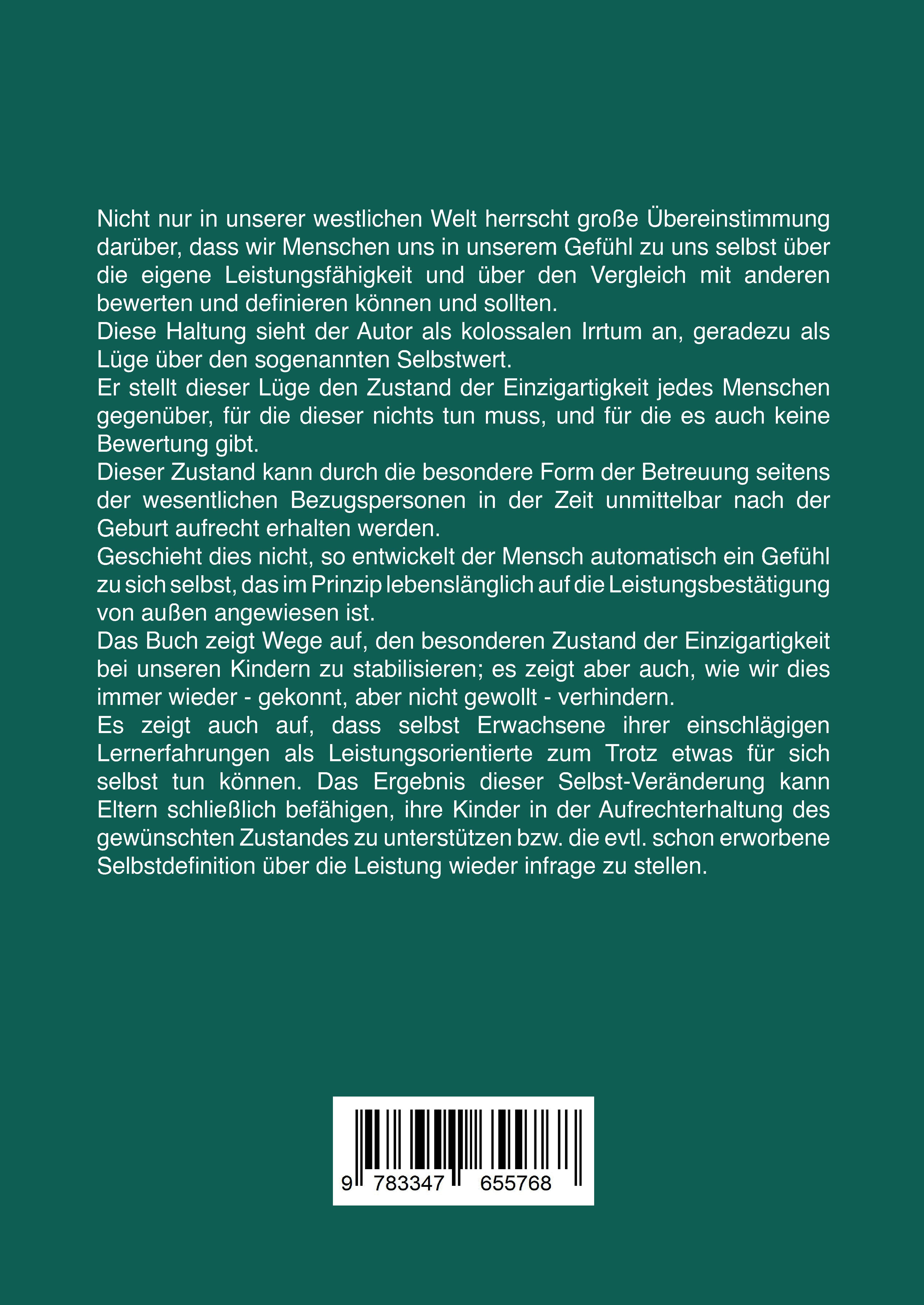 Wenn auf diesem Planeten ein Kind geboren wird, gerät es in eine konkrete Umgebung, von der es annehmen muss, dass sie die ganze Welt repräsentiert. Und daher wird es alles, was es erfährt, als richtig, stimmig und wahr erleben und auch glauben.Aber: Eine Wahrheit ist das nie! Jede Kultur, in die ein Kind hineingeboren wurde, hat sich im Laufe der Jahrtausende entwickelt. Und dabei sind zwangsläufig besondere Einstellungen, Haltungen, Vorstellungen von Moral und Ethik und Religion etc. entstanden. Und die Mitglieder dieser Gemeinschaften vertreten dies alles oft recht kritiklos.Aber noch einmal: All dies ist lediglich ein "Für-Wahr-Halten" innerhalb dieser besonderen Kultur. Aber keine allumfassende, für jeden Menschen gültige "Wahrheit".Warum habe ich dieses Buch geschrieben? In unserer Gesellschaft herrscht u.a. die kaum infrage gestellte Überzeugung, dass jeder Mensch sich selbst über seine Leistungen, seine Erfolge, sein Ansehen und sein Hab und Gut bewerten kann und darf. Das wird als allgemein gültige Wahrheit und Selbstverständlichkeit "verkauft".Allerdings wird dabei verschwiegen oder schlicht nicht wahrgenommen, dass Leistungen und Erfolge immer wieder erneut erarbeitet werden müssen. Denn die guten Gefühle über Anerkennung und Applaus versickern nach sehr kurzer Zeit schon wieder. Und das ewige Ackern-müssen macht oft sehr krank!Ich vertrete hingegen die Haltung, dass es unsinnig und gefährlich ist, einen Menschen über seine Leistungen - im weitesten Sinne - zu bewerten. Meine Erfahrung zeigt, dass eine solche Erwartungshaltung z.B. der Verunglimpfung, Abwertung und Verfolgung derer, die den zugrundeliegenden Ansprüchen und Ideologien irgendwie nicht genügen, Tür und Tor öffnet. Und diese Erfahrung trägt ebenfalls erheblich zu vielerart Krankheiten und psychischen Problemen bei.Dem gegenüber versuche ich die Einsicht zu vermitteln, dass jeder Mensch im Prinzip von Anfang an wertvoll und gleichwertig mit allen anderen Menschen dieses Planeten ist. Die Bewertung einer einzelnen Person ist daher völlig unsinnig. Bewertet kann allenfalls das Ergebnis eines Tuns. Welches mit der Person selbst nicht identisch ist! Eine solche Haltung erscheint mir definitiv angemessener und menschenwürdiger. Im Text zeige ich zunächst auf, welche Bedeutung schon die Schwangerschaft für die Stabilisierung des Zustandes der würdevollen Einzigartigkeit haben kann.Ich mache deutlich, dass wir unseren Kindern nach der Geburt zwar mit zumeist guten Absichten begegnen, viel zu oft aber mit unangemessenem Verhalten.Ich zeige schließlich auf, unter welchen Voraussetzungen es möglich wäre, diesen Urzustand der Einzigartigkeit aufrecht zu erhalten.Dabei sehe ich die "bedingungslose Liebe" als die wesentliche Grundvoraussetzung für ein diesbezügliches Gelingen an. Ich entwickle daraufhin Phantasien, wie sich ein solcherart geförderter Mensch in unserer Gesellschaft vermutlich verhalten und fühlen wird.Auf der anderen Seite stelle ich aber auch recht ausführlich dar, wie in unserer Gesellschaft die generelle Leistungsorientierung - hier Fremdwertgefühl genannt - entstehen kann, aufrecht erhalten wird und unsere Gefühle und unser Verhalten prägt.Schlussendlich zeige ich auf, was Erwachsene für sich selbst tun können, um sich von der Fremdwertgefühl-Falle etwas intensiver zu distanzieren und ihre Kinder somit unterstützen können, gar nicht erst in diese Falle hinein zu stolpern.
