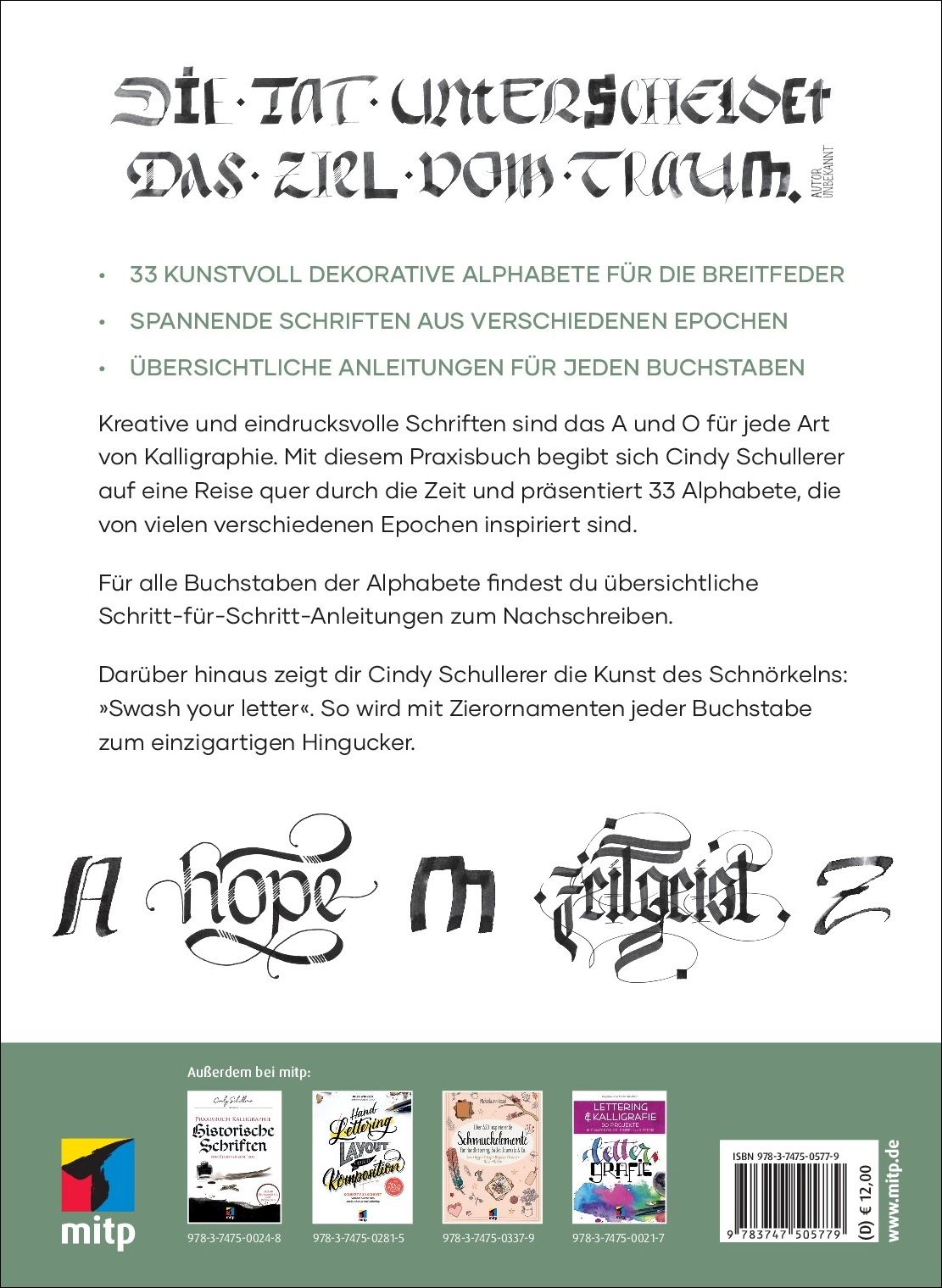 Kreative und eindrucksvolle Schriften sind das A und O für jede Art von Kalligraphie. Mit diesem Praxisbuch begibt sich Cindy Schullerer auf eine Reise quer durch die Zeit und präsentiert 33 Alphabete, die von vielen verschiedenen Epochen inspiriert sind.