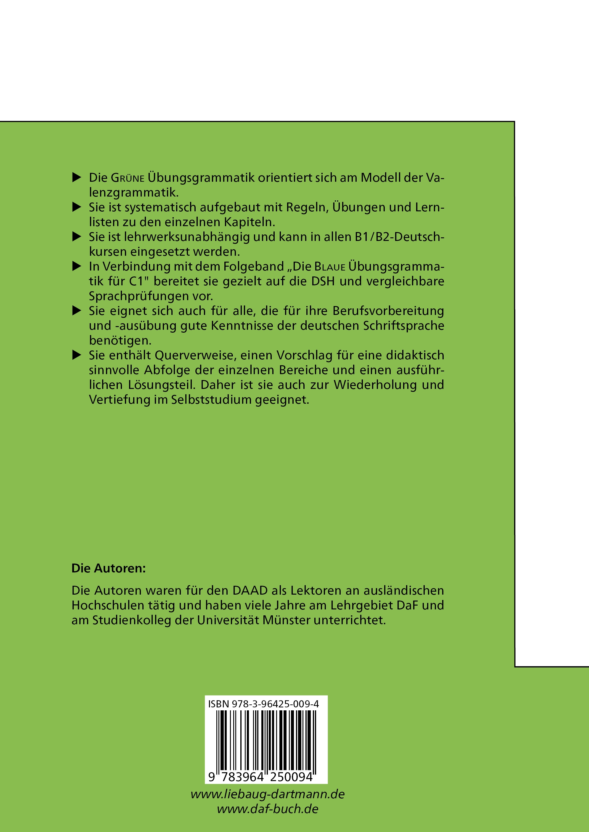 Die Grüne (Übungsgrammatik für B1 / B2) richtet sich an Deutsch-Lernende mit Grundkenntnissen.Sie ist eine Überarbeitung und Erweiterung der "Übungsgrammatik für die Grundstufe" von Friedrich Clamer und Erhard G. Heilmann, die aus der Unterrichtspraxis des "Lehrgebiets Deutsch als Fremdsprache" und des "Studienkollegs für ausländische Studierende" an der Universität Münster hervorgegangen und seit 1997 in mehreren Auflagen erschienen ist.Sie legt die grammatischen Grundlagen für den Spracherwerb bis zum B2-Abschluss, kann lehrwerkunabhängig, ggf. zur Vertiefung und Wiederholung, in einem reinen Grammatik-Unterricht sowie begleitend zu allen Sprachlehrwerken eingesetzt werden. Durch den angefügten Lösungsteil eignet sie sich aber auch zum Selbststudium, besonders im Ausland.In Verbindung mit dem ebenfalls neu bearbeiteten Folgeband Die Blaue (Übungsgrammatik für C1) deckt sie alle Grammatikkapitel ab, die für eine umfassende sprachliche Vorbereitung auf Ausbildung, Beruf und - vor allem - Studium im deutschsprachigen Raum unverzichtbar sind.Allen Kolleginnen und Kollegen danke ich für zahlreiche Hinweise, vor allem aber Ulrike Lindemann für die freundliche Überlassung eigener Unterrichtsmaterialien.Mein besonderer Dank gilt Bruno Liebaug vom Lektorat des Verlags Liebaug-Dartmann, der diese Überarbeitung der Grünen Grammatik mit vielen eigenen Vorschlägen ebenso kompetent wie engagiert und geduldig begleitet hat.Die Grüne Übungsgrammatik orientiert sich am Modell der Valenzgrammatik.- Sie ist systematisch aufgebaut mit Regeln, Übungen und Lernlistenzu den einzelnen Kapiteln.- Sie ist lehrwerksunabhängig und kann in allen B1/B2-Deutschkurseneingesetzt werden.- In Verbindung mit dem Folgeband "Die Blaue Übungsgrammatikfür C1" bereitet sie gezielt auf die DSH und vergleichbare Sprachprüfungen vor.- Sie eignet sich auch für alle, die für ihre Berufsvorbereitung und -ausübung gute Kenntnisse der deutschen Schriftsprachebenötigen.- Sie enthält Querverweise, einen Vorschlag für eine didaktisch sinnvolle Abfolge der einzelnen Bereiche und einen ausführlichen Lösungsteil. Daher ist sie auch zur Wiederholung und Vertiefung im Selbststudium geeignet.