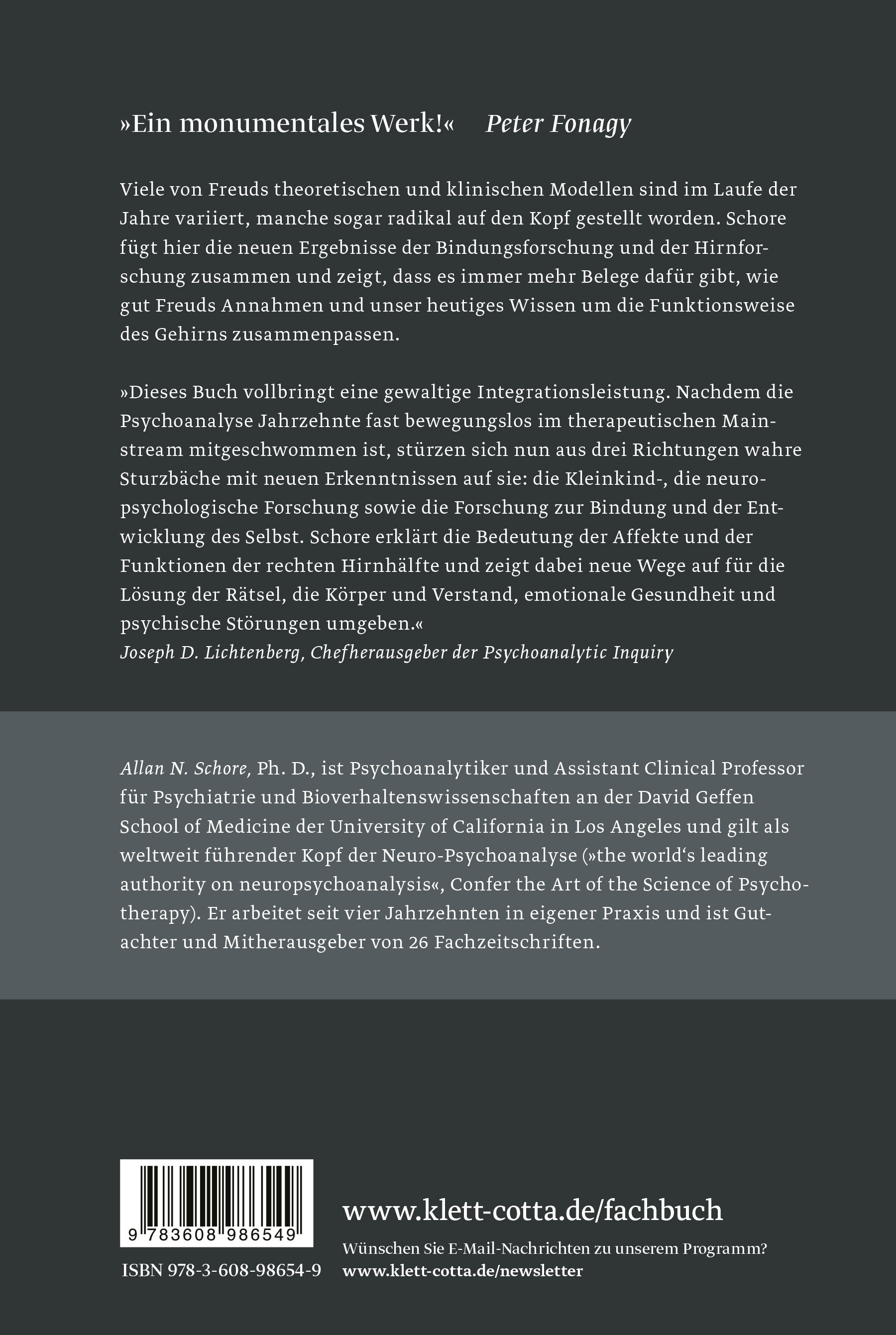 »Dieses Buch vollbringt eine gewaltige Integrationsleistung. Nachdem die Psychoanalyse Jahrzehnte fast bewegungslos im therapeutischen Mainstream mitgeschwommen ist, stürzen sich nun aus drei Richtungen wahre Sturzbäche mit neuen Erkenntnissen auf sie: die Kleinkind-, die neuropsychologische Forschung sowie die Forschung zur Bindung und der Entwicklung des Selbst. Schore erklärt die Bedeutung der Affekte und der Funktionen der rechten Hirnhälfte und zeigt dabei neue Wege auf für die Lösung der Rätsel, die Körper und Verstand, emotionale Gesundheit und psychische Störungen umgeben.« Joseph D. Lichtenberg, Chefherausgeber der Psychoanalytic Inquiry