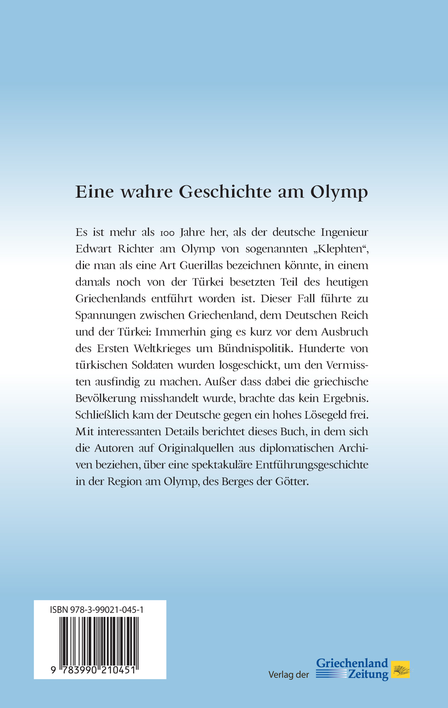 An der Westseite des Götterberges Olymp liegt auf einer Höhe von 1.250 Metern das pittoreske Dorf Kokkinopilos oder Kokkinoplo, das seinen Namen nach dem roten Boden trägt, auf dem es steht. In dieser Region kam es im Sommer 1911 zur Entführung eines deutschen Staatsbürgers, die zu Spannungen zwischen Griechenland, der Türkei und dem Deutschen Reich führte. Edwart Richter, ein deutscher Ingenieur, hatte den Plan, als Erster den Gipfel des Olymps zu besteigen, und endete schließlich in den Händen von "Guerillabanden", den sogenannten Klephten, die ein Lösegeld erpressen wollten. Kokkinoplo befand sich bis zur Befreiung im Oktober 1912 noch auf türkischem Gebiet; die griechisch-türkische Grenze verlief vom Ambrakischen Golf im Westen über Arta bis zum unteren Olymp im Osten. Das vorliegende Buch basiert auf der offiziellen Korrespondenz des griechischen Außenministeriums, dem Buch "The Richter Case" von Giannis Adamou, weiteren Veröffentlichungen sowie auf Richters eigenem Buch "Meine Erlebnisse in der Gefangenschaft am Olymp nebst Schilderung der Entwicklung des Klephtenwesens." Am Vorabend der Balkankriege und des Ersten Weltkrieges herrschte in Europa ein ständiger Wechsel von Allianzen. Vor diesem politischen Hintergrund bereitete sich Edwart Richter Anfang 1911 in der Stadt Jena auf seine dritte Reise nach Hellas vor. Die Griechen allerdings beschlossen, ihn nach seiner Ankunft zu entführen, um so weitere Probleme in den Beziehungen zwischen Berlin und Konstantinopel zu schaffen. Das Osmanische Reich wurde in der Folge bei seinem Verbündeten Deutschland diskreditiert und zeigte Europa, dass es weder seine Bürger schützen noch seine Territorien kontrollieren konnte. Die Entführung Richters hob die Moral der in den osmanischen Gebieten ansässigen Griechen und Griechenlands im Allgemeinen sowie der griechischen Armee im Besonderen, da die Entführer einen Teil des Lösegelds den Militärs übergaben.
