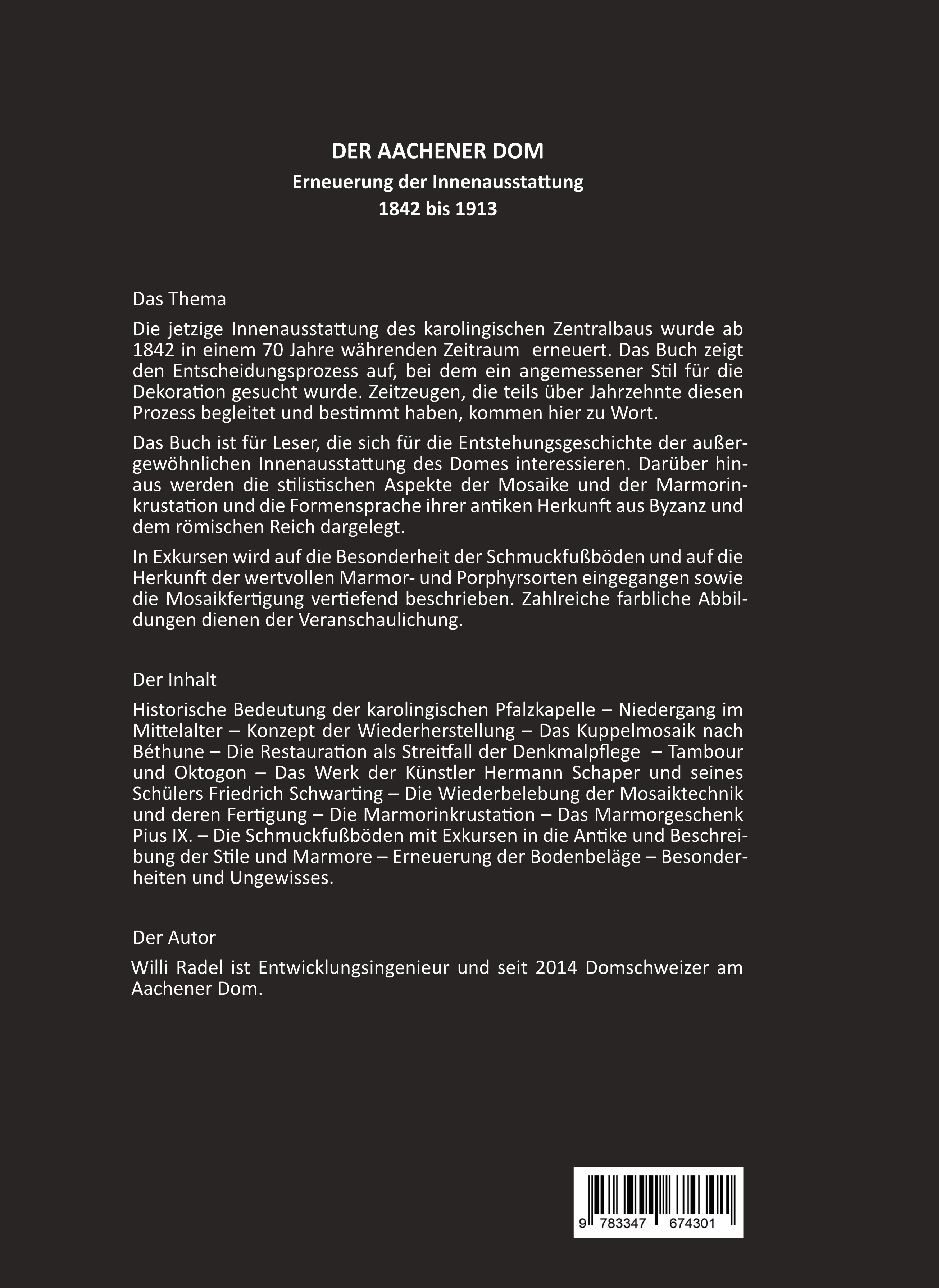 Der Aachener Dom beeindruckt, erstaunt oder überrascht auch durch seine prächtige Innenausstattung. Aus dem Halbdunkel der Gewölbe öffnet sich der Blick im Oktogon hinauf zur Kuppel mit seiner erhabenen Ikonographie im karolingischen Zentralbau. Die heutige Ausstattung mit Mosaik und Marmor ist das Ergebnis einer fast 70 Jahre andauernden Erneuerung. Sie war erforderlich geworden, nachdem die bisherige Innenausstattung durch Beschädigungen und Vernachlässigung gelitten hatte. Das Buch beschreibt den mühsamen Werdegang. Beim Quellenmaterial wurde hauptsächlich auf die Beteiligten selbst, auf Zeitzeugen und zeitnahe Dokumente zurückgegriffen. Bei der wissenschaftliche Deutung wurde nationale und internationale Forschung zitiert. Darüber hinaus wird auf die Technik der Mosaizierung, die antiken Marmorsorten und die Schmuckfußböden eingegangen.