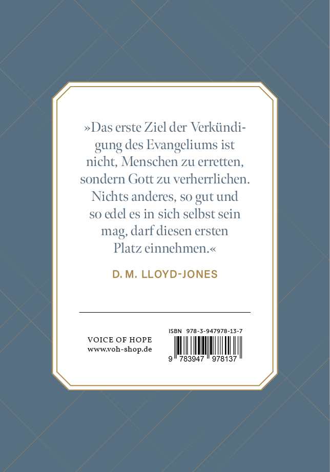 D. Martyn Lloyd-Jones (1899-1981) war Pastor in der Westminster Chapel und Autor zahlreicher Bücher. Dazu zählen eine 14-bändige Auslegung des Römerbriefes (sowie zahlreiche weitere Auslegungen), »Die Predigt und der Prediger« und »Einig in Wahrheit«.