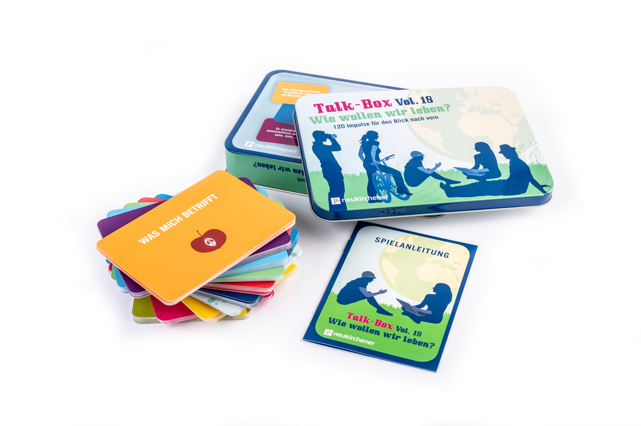 Die Generation "Fridays for Future" macht sich rege Gedanken über Heute und die Zukunft, aber auch Menschen älterer Generationen stellen sich die Frage: Wie wollen wir leben? In die Zukunft schauen können wir nicht. Uns die Zukunft erträumen schon: Was wäre, wenn...? Nur mal angenommen, ich könnte... Ja, was wollte ich dann? Wie stelle ich mir mein privates Glück vor? Und wie könnte das gute Leben für alle aussehen?Denn darum gehts bei dieser Talk-Box: Meine "kleine Welt" und die "große Welt" da draußen gehören zusammen, und beide kommen in den 120 Impulskarten vor. Mit allen Themen für den "Blick nach vorn": Beziehungen und Familie, Natur und Klima, Freiheit und Grenzen, Gerechtigkeit, Glaube, Lebens(t)räume...Also, los gehts! Gemeinsam spielen macht nicht nur Spaß, sondern multipliziert auch die guten Ideen. Die Talk-Box Vol. 18 hilft beim spielerischen und ungezwungenen Austausch - innerhalb und zwischen den Generationen!