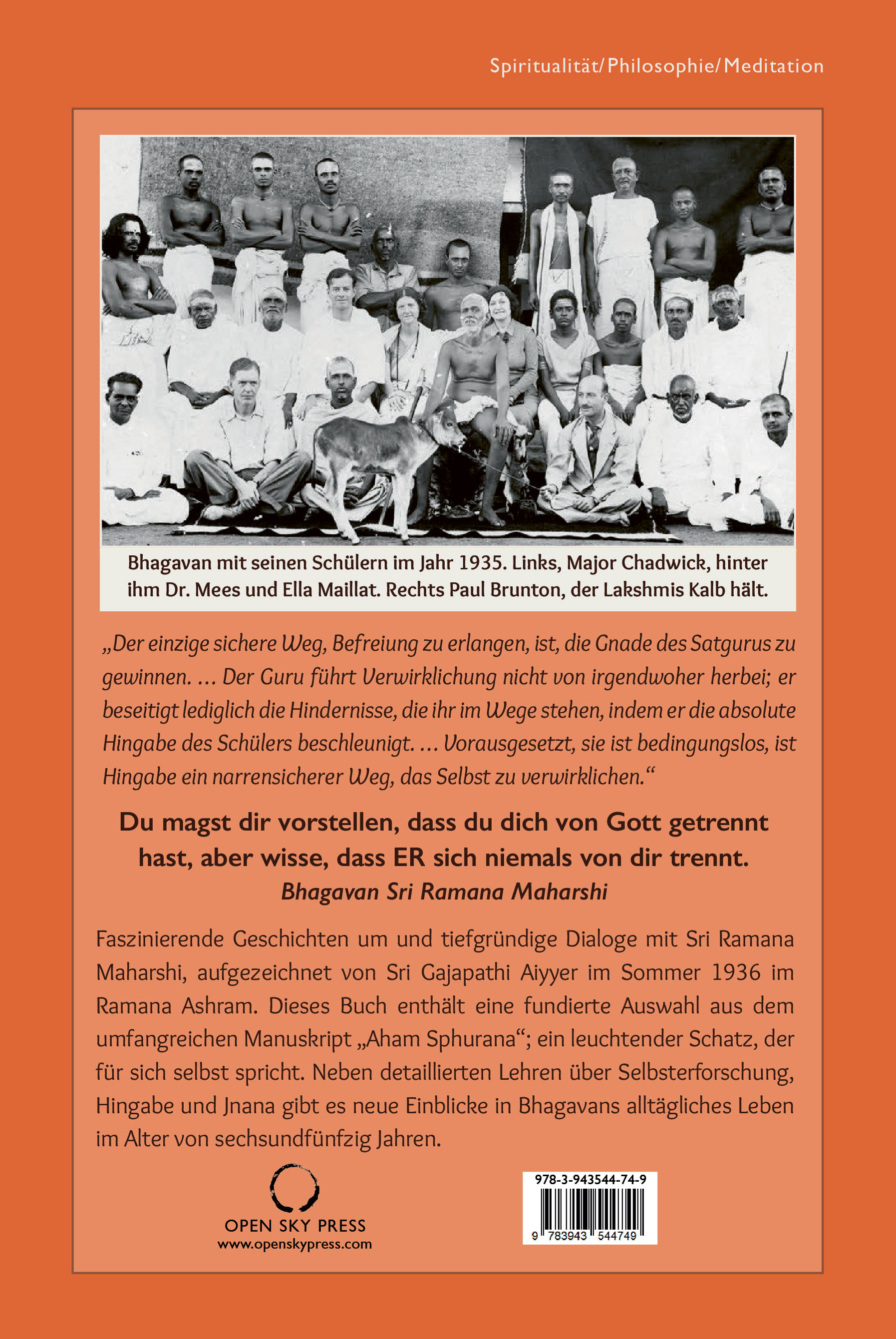 Die essentiellen Lehren des "Aham Sphurana" - Manuskripts bieten einen neuen, vollkommeneren Blick auf Bhagavan Sri Ramana Maharshi als spirituellen Meister im mittleren Alter vonsechsundfünfzig Jahren. Geschichten aus dem täglichen Leben im Ashram enthüllen sein facettenreiches Wesen und seine tiefe Kraft auf eine Weise, die der Öffentlichkeit bisher kaum zugänglich war.Bhagavan, geboren 1879, ist einer der berühmtesten und jüngsten unter Indiens zahlreichen Weisen, Heiligen und spirituellen Meistern. Im Alter von sechzehn Jahren hatte er ein spontanes Erwachen. Er verließ sein Zuhause in Madurai und machte sich auf den Weg nach Tiruvannamalai zum heiligen Berg Arunachala. Hier lebte und lehrte er, bis er 1950 seinen Körper verließ.Wir möchten den Leser ermutigen, offen zu sein für ein Abenteuer in Stille, für eine neue Perspektive auf Bhagavans tägliches Leben und für die eigene innere Transformation durch seine klaren und erhellenden Lehren über Selbsterforschung, Hingabe und Jnana. Diese Auswahl ist ein wahrer Schatz für Anhänger Bhagavans wie für alle spirituell interessierten Menschen.