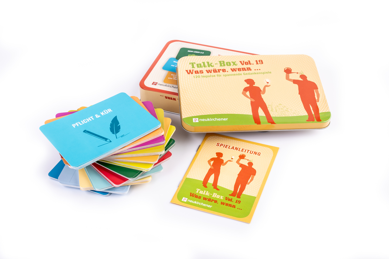 Einfach mal drauflosspinnen? Bei dieser Talk-Box wird spekuliert, was das Zeug hält: Was wäre, wenn ich mein Leben für drei Monate auf Probe ändern könnte? Oder wenn jeder Tag vier Stunden mehr hätte? Und was würde passieren, wenn ich die Gedanken Anderer lesen könnte?Vielleicht werden wir es nie wissen. Aber es macht unglaublich viel Spaß, mal darüber zu reden. Bei diesen kreativen Gedankenspielen, die das Unmögliche und auch das Vielleicht-Mögliche in den Blick nehmen, kommt jeder zu Wort. Schließlich gibt es unzählige Möglichkeiten, was denn wäre, wenn ... Und ganz nebenbei führt uns diese Frage immer auch ein Stück in unser Inneres. Dorthin, wo Träume, Wünsche, Erinnerungen und vieles andere wohnt, was das Leben schön macht.Die 120 Impulskarten laden dazu ein, die Fantasie spielen zu lassen - zum Beispiel beim Spieleabend im Freundeskreis, als Paar oder im Familienurlaub. Mit überraschenden Erkenntnissen für alle. Auch für Gemeindearbeit, Schule und Freizeitgruppen bietet diese Talk-Box spannende Einsatzmöglichkeiten. Was wäre, wenn Sie, du und ihr es einfach mal ausprobiert?