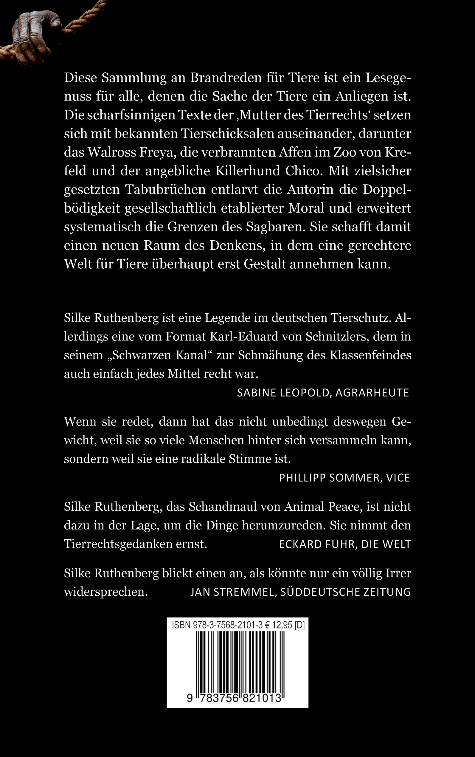 Silke Ruthenberg ist die vegane Veteranin und Mutter der Tierrechtsbewegung in Deutschland. Bereits in den 90er-Jahren legte sie hier den Grundstein für den Veganismus und verschaffte mit der von ihr geführten Tierrechtsorganisation Animal Peace dem Tierrecht einen nie dagewesenen öffentlichen Auftritt. Mutig und unbeirrbar wie eh und je setzt Ruthenberg auch heute noch einzigartige Meilensteine für das Tierrecht. Sie baut dabei auf die wirklichkeitsstiftende Macht der Sprache. Ihre Texte vereinen Leidenschaft und Logik zu einem Manifest für die Interessen der Tiere. Sie ist parteiische Anwältin, die ihrem Auftrag gerecht wird, kein belehrender Moralapostel, der seinen Mitmenschen mit larmoyanten Vorträgen erklärt, was gut ist und was böse. Ihre Moral ist inspirierend, humorvoll, geistreich und stark.