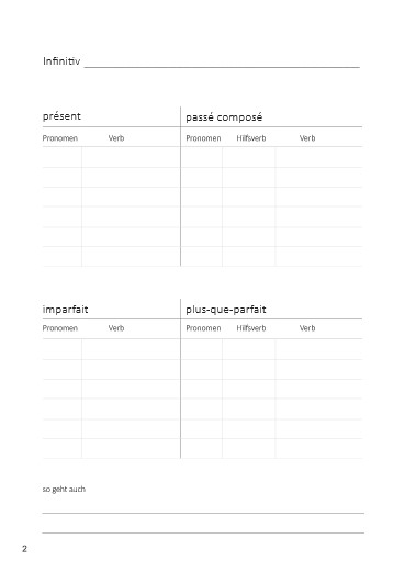 Übersichtliches Tabellenheft in DIN A4 zum Ausfüllen und Nachschlagen. Für Verbkonjugationen im présent, passé composé, imparfait und plus-que-parfait. Die zusammengesetzten Zeiten direkt untereinander, um das Konzept deutlich zu machen.