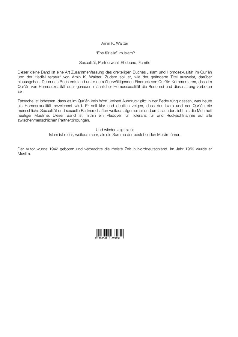 Es gibt im Qur'ân kein Wort, keinen Ausdruck in der Bedeutung dessen, was heute als Homosexualität bezeichnet wird. Es soll klar und deutlich gezeigt werden, dass der Islam und der Qur'ân die menschliche Sexualität und sexuelle Partnerschaften weitaus allgemeiner und umfassender sieht als die Mehrheit heutiger Muslime. Dieser Band ist mithin ein Plädoyer für Toleranz für und Rücksichtnahme auf alle zwischenmenschlichen Partnerbindungen