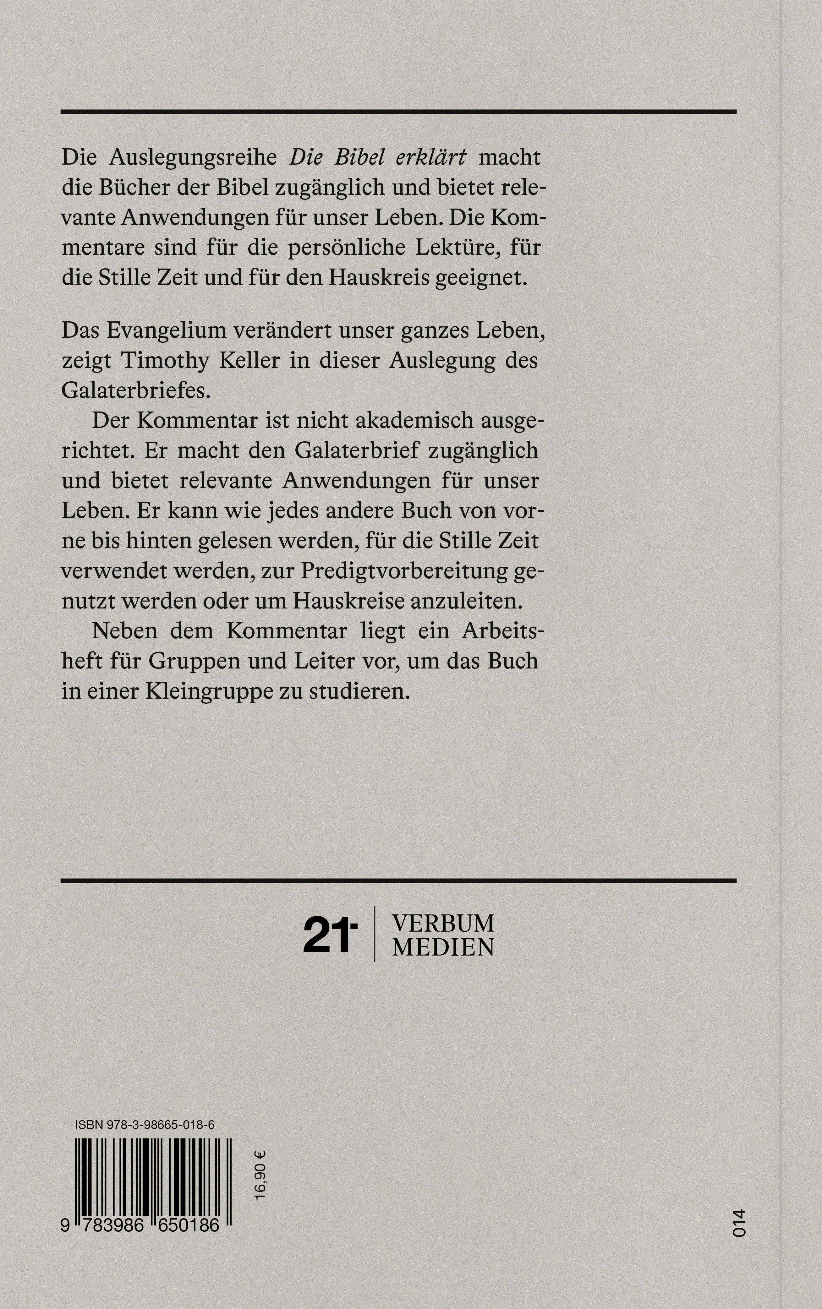 | Schlagworte | Andachten • Bibel • Bibelarbeit • Bibelauslegung • Bibelbuch • Bibelkommentar • Bibellesen • Bibelstudium • Brief an die Galater • Die Bibel verstehen • Galater • Galaterbrief • Hauskreis • Kleingruppe • Predigtvorbereitung • reformatorisch • Stille Zeit • Textauslegung • Timothy Keller • Verbum |