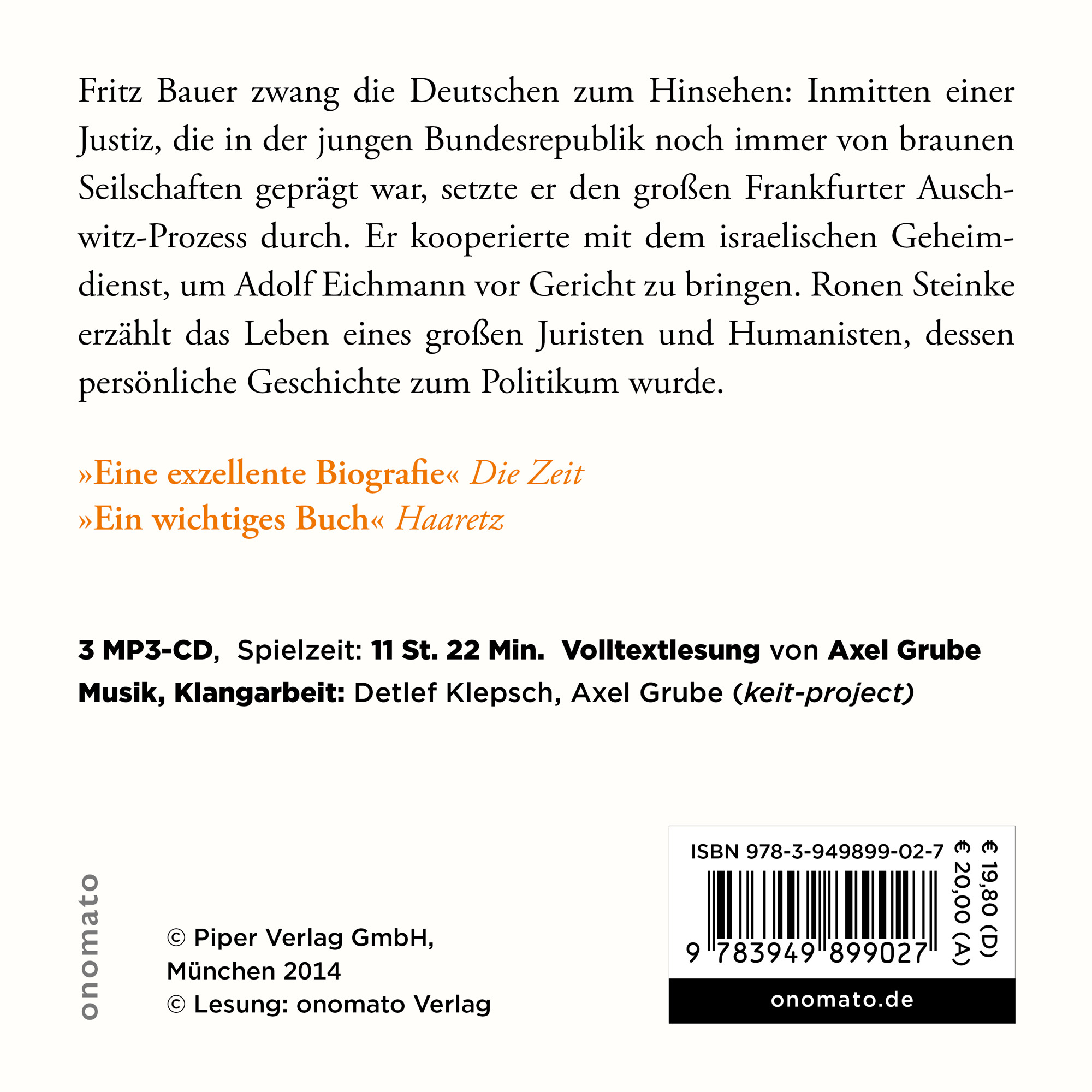 Fritz Bauer zwang die Deutschen zum Hinsehen: Inmitten einer Justiz, die in der jungen Bundesrepublik noch immer von braunen Seilschaften geprägt war, setzte er den großen Frankfurter Auschwitz-Prozess durch. Er kooperierte mit dem israelischen Geheimdienst, um Adolf Eichmann vor Gericht zu bringen. Ronen Steinke erzählt das Leben eines großen Juristen und Humanisten, dessen persönliche Geschichte zum Politikum wurde.