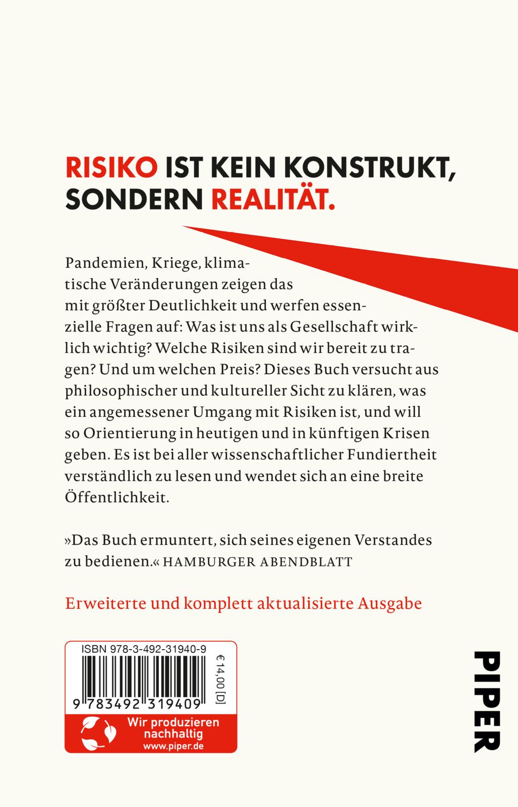 Pandemien, Kriege, klimatische Veränderungen zeigen das mit größter Deutlichkeit und werfen essenzielle Fragen auf: Was ist uns als Gesellschaft wirklich wichtig? Welche Risiken sind wir bereit zu tragen? Und um welchen Preis? Dieses Buch versucht aus philo-sophischer und kultureller Sicht zu klären, was ein angemessener Umgang mit Risiken ist, und will so Orientierung in heutigen und in künftigen Krisen geben. Es ist bei aller wissenschaftlicher Fundiertheit verständlich zu lesen und wendet sich an eine breite Öffentlichkeit.