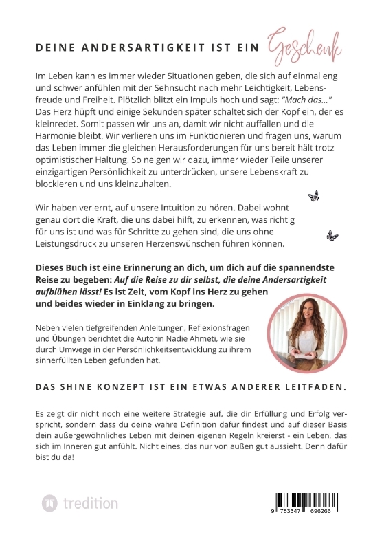 Im Leben kann es immer wieder Situationen geben, die sich auf einmal eng und schwer anfühlen mit der Sehnsucht nach mehr Leichtigkeit, Lebensfreude und Freiheit. Plötzlich blitzt ein sanfter Impuls hoch und sagt: "Mach das...!" Das Herz hüpft und einige Sekunden später schaltet sich der Kopf ein, der alles kleinredet. Somit passen wir uns an, damit wir nicht auffallen und die Harmonie bleibt. Wir verlieren uns im Funktionieren und fragen uns, warum das Leben immer die gleichen Herausforderungen für uns bereit hält trotz optimistischer Haltung.Wenn wir nur aus dem Verstand heraus handeln (aus alten Erfahrungen und konditionierten Mustern), neigen wir dazu, immer wieder Teile unserer einzigartigen Persönlichkeit zu unterdrücken, unsere Lebenskraft zu blockieren und uns klein zu machen. Wir haben verlernt, auf unsere Intuition zu hören. Dabei wohnt genau dort die Kraft, die uns dabei hilft, zu erkennen, was richtig für uns ist und was für Schritte zu gehen sind, die uns ohne Leistungsdruck zu unseren Herzenswünschen führen können.Dieses Buch ist eine Erinnerung an dich, um dich auf die spannendste Reise zu begeben: Auf die Reise zu dir selbst, die deine Andersartigkeit aufblühen lässt! Es ist Zeit, vom Kopf ins Herz zu gehen und beides in Einklang zu bringen.Neben vielen tiefgreifenden Anleitungen, Reflexionsfragen und Übungen berichtet die Autorin Nadie Ahmeti, wie sie durch Umwege in der Persönlichkeitsentwicklung zu ihrem sinnerfüllten Leben gefunden hat. Ihr Ratgeber zeigt dir Schritt für Schritt, wie du die Verbindung zu deinem inneren Kompass bewusst wahrnimmst und vom Kopf unterscheiden lernst. Auch wie du das Vertrauen aufbaust, das dir hilft, dich so zu zeigen, wie du wirklich bist und für das loszugehen, das gelebt werden will. Das Shine Konzept ist ein etwas anderer Leitfaden. Es zeigt dir nicht noch eine weitere Strategie auf, die dir Erfüllung und Erfolg verspricht, sondern dass du deine wahre Definition dafür findest und auf dieser Basis dein außergewöhnliches Leben mit deinen eigenen Regeln kreierst - ein Leben, das sich im Inneren gut anfühlt. Nicht eines, das nur von außen gut aussieht. Denn dafür bist du da!