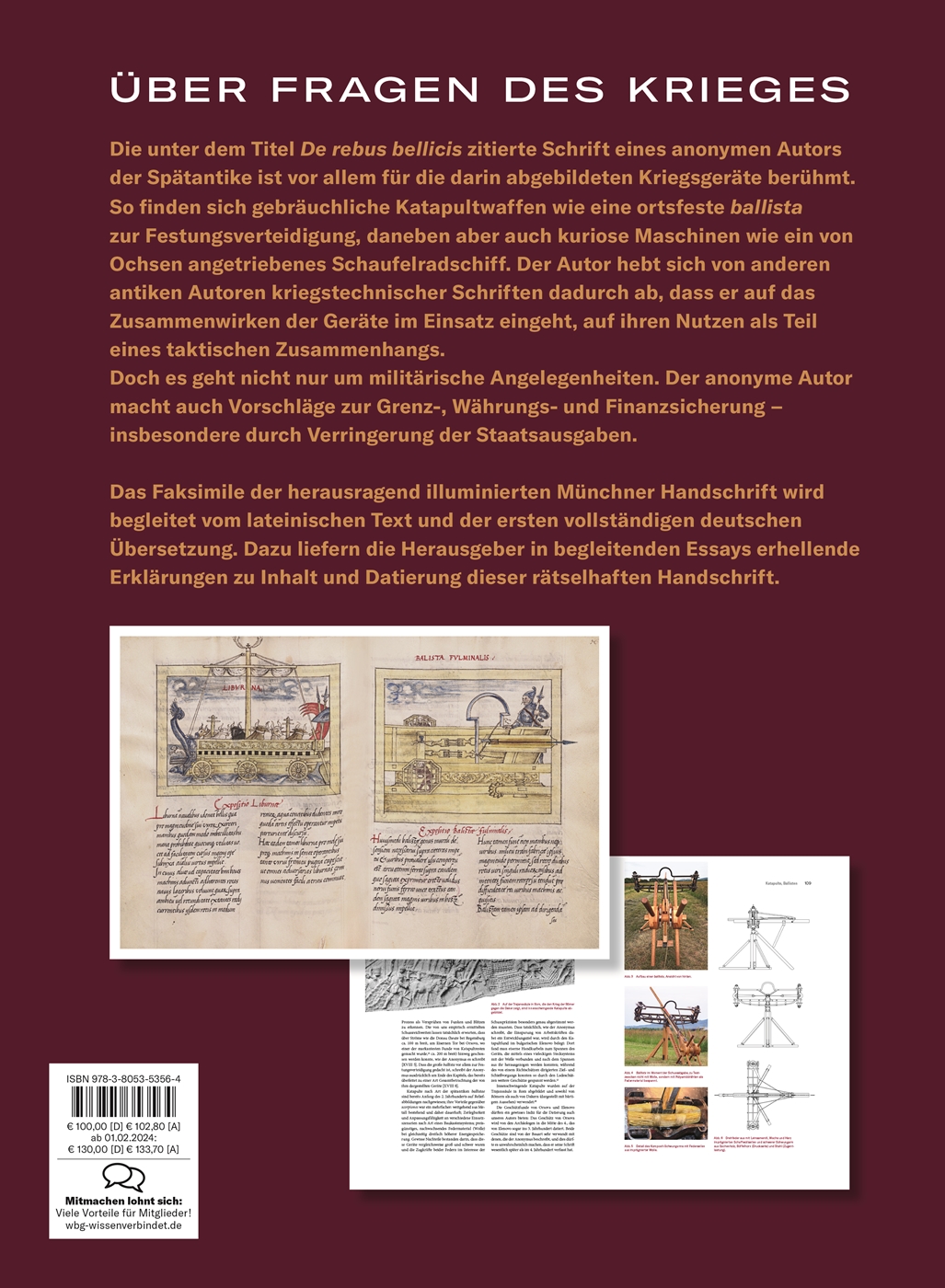 Angesichts des drohenden Ansturms barbarischer Völker nennt ein Anonymus Missstände im spätantiken Römischen Reich beim Namen und macht Verbesserungsvorschläge. Umstritten ist bis heute, ob die schon im Original von Abbildungen begleitete Schrift »De rebus bellicis« als beißende Ironie über spätrömische Zustände oder in reformerischer Absicht verfasst wurde. Das Faksimile der herausragend illustrierten Münchner Handschrift wird begleitet von dem lateinischen Text und der ersten vollständigen deutschen Übersetzung überhaupt. Stefanie Gräf führt in den Text und seine Geschichte ein. Bis in technische Details stellt Burkhard Meißner das teils fantastisch anmutende Kriegsgerät vor - darunter ein von Ochsen angetriebenes Schaufelradschiff. Durch die Rekonstruktion der Überlieferungsgeschichte sowie den Nachbau der antiken Waffen können Gräf und Meißner jahrhundertelang tradierte Missverständnisse ausräumen. Doch manches an dieser großartig illuminierten Schrift bleibt bis heute rätselhaft.