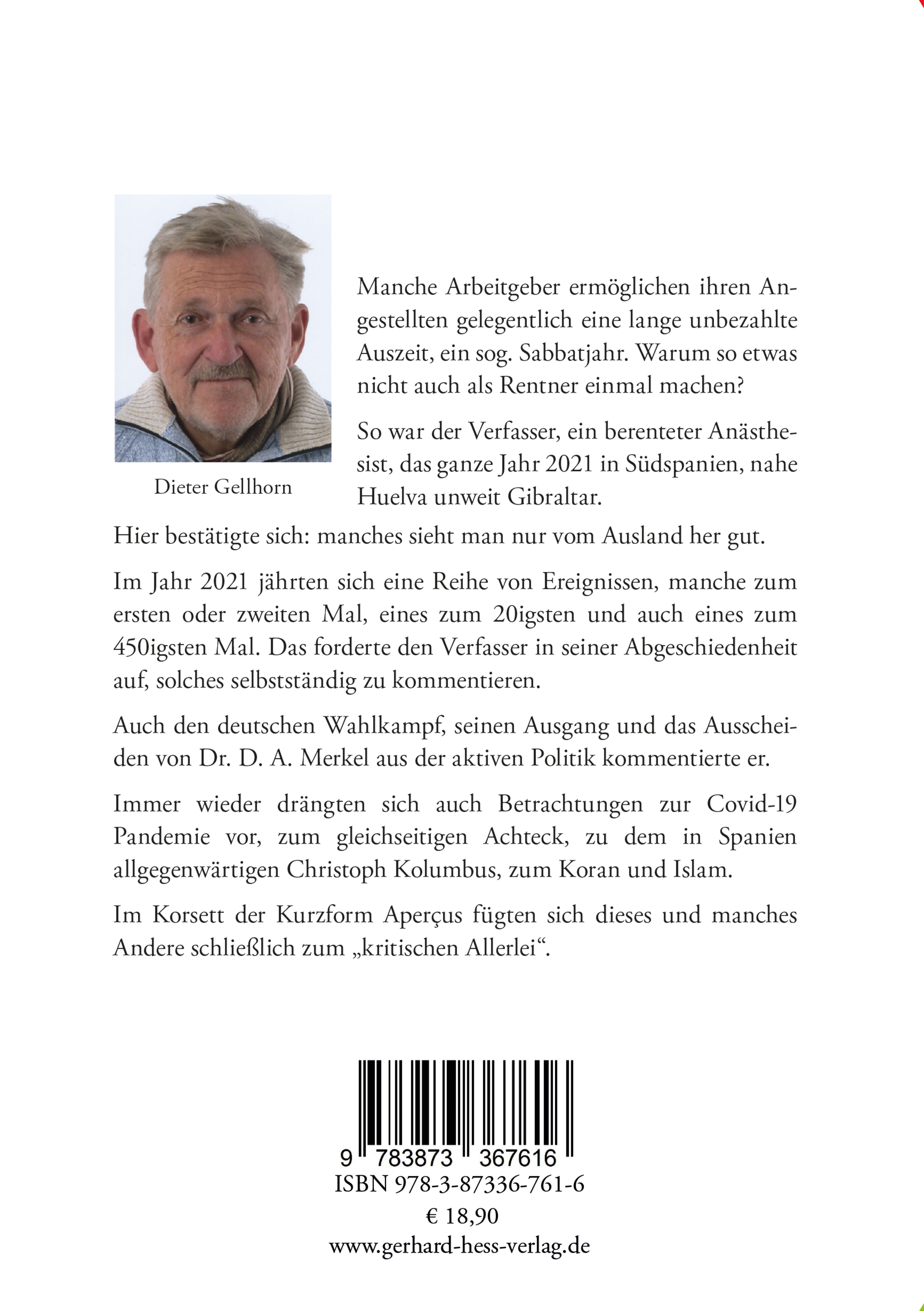 Manche Arbeitgeber ermöglichen ihren Angestellten gelegentlich eine lange unbezahlte Auszeit, ein sog. Sabbatjahr. Warum so etwas nicht auch als Rentner einmal machen? So war der Verfasser, ein berenteter Anästhesist, das ganze Jahr 2021 in Südspanien, nahe Huelva unweit Gibraltar. Hier bestätigte sich: manches sieht man nur vom Ausland her gut. Im Jahr 2021 jährten sich eine Reihe von Ereignissen, manche zum ersten oder zweiten Mal, eines zum 20igsten und auch eines zum 450igsten Mal. Das forderte den Verfasser in seiner Abgeschiedenheit auf, solches selbstständig zu kommentieren. Auch den deutschen Wahlkampf, seinen Ausgang und das Ausscheiden von Dr. D. A. Merkel aus der aktiven Politik kommentierte er. Immer wieder drängten sich auch Betrachtungen zur Covid-19 Pandemie vor, zum gleichseitigen Achteck, zu dem in Spanien allgegenwärtigen Christoph Kolumbus, zum Koran und Islam. Im Korsett der Kurzform Aperçus fügten sich dieses und manches Andere schließlich zum "kritischen Allerlei".