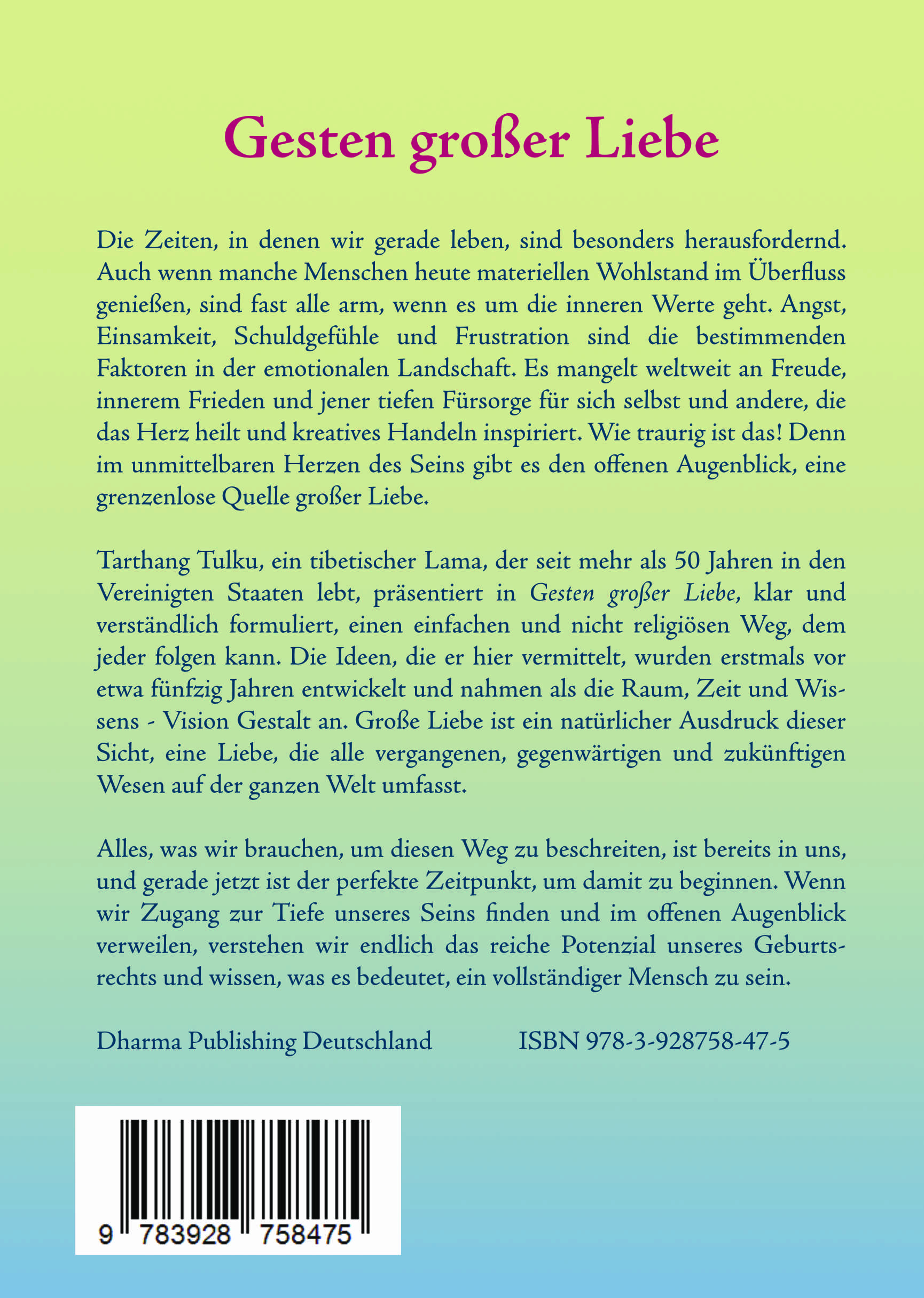 Die Zeiten, in denen wir gerade leben, sind besonders herausfordernd. Auch wenn manche Menschen heute materiellen Wohlstand im Überfluss genießen, sind fast alle arm, wenn es um die inneren Werte geht. Angst, Einsamkeit, Schuldgefühle und Frustration sind die bestimmenden Faktoren in der emotionalen Landschaft. Es mangelt weltweit an Freude, innerem Frieden und jener tiefen Fürsorge für sich selbst und andere, die das Herz heilt und kreatives Handeln inspiriert. Wie traurig ist das! Denn im unmittelbaren Herzen des Seins gibt es den offenen Augenblick, eine grenzenlose Quelle großer Liebe.Tarthang Tulku, ein tibetischer Lama, der seit mehr als 50 Jahren in den Vereinigten Staaten lebt, präsentiert in Gesten großer Liebe, klar und verständlich formuliert, einen einfachen und nicht religiösen Weg, dem jeder folgen kann. Die Ideen, die er hier vermittelt, wurden erstmals vor etwa fünfzig Jahren entwickelt und nahmen als die Raum, Zeit und Wissens - Vision Gestalt an. Große Liebe ist ein natürlicher Ausdruck dieser Sicht, eine Liebe, die alle vergangenen, gegenwärtigen und zukünftigen Wesen auf der ganzen Welt umfasst.Alles, was wir brauchen, um diesen Weg zu beschreiten, ist bereits in uns, und gerade jetzt ist der perfekte Zeitpunkt, um damit zu beginnen. Wenn wir Zugang zur Tiefe unseres Seins finden und im offenen Augenblick verweilen, verstehen wir endlich das reiche Potenzial unseres Geburtsrechts und wissen, was es bedeutet, ein vollständiger Mensch zu sein.