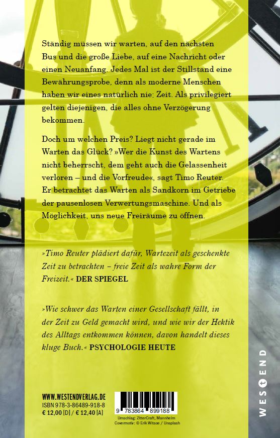 "Durch die Digitalisierung haben wir das Warten verlernt, gleichzeitig nimmt es immer mehr Zeit in unserem Leben ein." die tageszeitung "Timo Reuter plädiert dafür, Wartezeit als geschenkte Zeit zu betrachten - freie Zeit als wahre Form der Freizeit." Der Spiegel "Meist ärgern wir uns, wenn wir Schlange stehen müssen oder uns rote Ampeln aufhalten. Dabei bergen solche Pausen die Chance des Innehaltens und der Entschleunigung." Focus "Wie schwer das Warten einer Gesellschaft fällt, in der Zeit zu Geld gemacht wird, und wie wir der Hektik des Alltags entkommen können, davon handelt dieses kluge Buch." Psychologie Heute "Reuters Auseinandersetzung mit allen Schattierungen des Wartens verleiht der zähen Zeit Farbe." Falter "Wer die Kunst des Wartens nicht beherrscht, dem geht auch Gelassenheit verloren" WDR5 "Timo Reuter hat sich intensiv mit unseren Wartezeiten befasst" hr2 Der Tag "Ein Buch für alle, die das Warten verlernt haben und die Reflexion lieben." Galore "Wer warten muss, ist meist arm dran. Als privilegiert gilt heute, wer alles sofort bekommt. Doch um welchen Preis? Und welche Kraft wohnt dem Nichtstun inne? Der Vorfreude? Timo Reuter hat 'Warten. Eine verlernte Kunst' geschrieben." Der Freitag "Warten ist kein unwichtiger Zustand, es ist ein Spiegel gesellschaftlicher Zustände." Neues Deutschland
