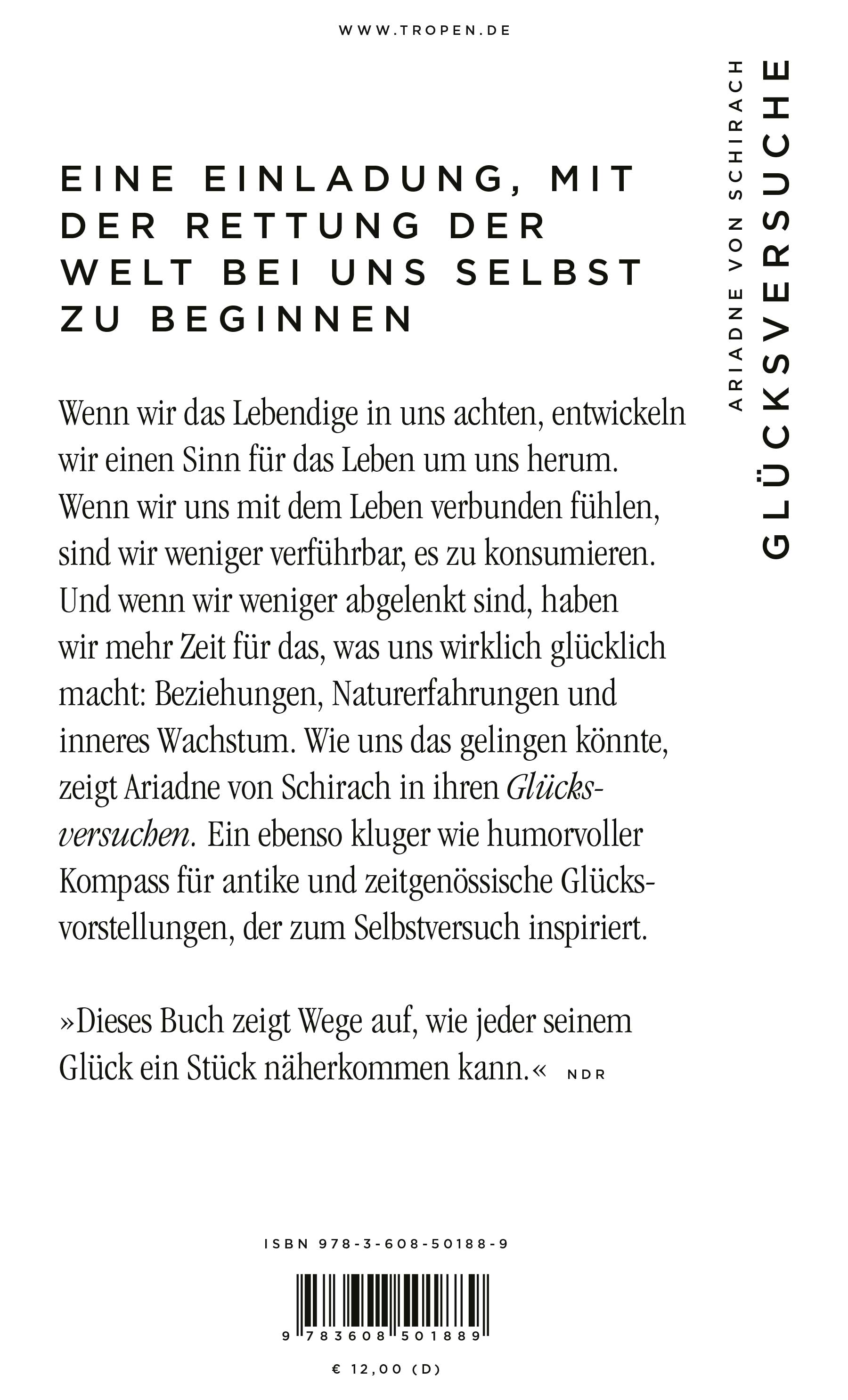 Wenn wir das Lebendige in uns achten, entwickeln wir einen Sinn für das Leben um uns herum. Wenn wir uns mit dem Leben verbunden fühlen, sind wir weniger verführbar, es zu konsumieren. Und wenn wir weniger abgelenkt sind, haben wir mehr Zeit für das, was uns wirklich glücklich macht: Beziehungen, Naturerfahrungen und inneres Wachstum. Wie uns das gelingen könnte, zeigt Ariadne von Schirach in ihren Glücksversuchen. Ein ebenso kluger wie humorvoller Kompass für antike und zeitgenössische Glücksvorstellungen, der zum Selbstversuch inspiriert.