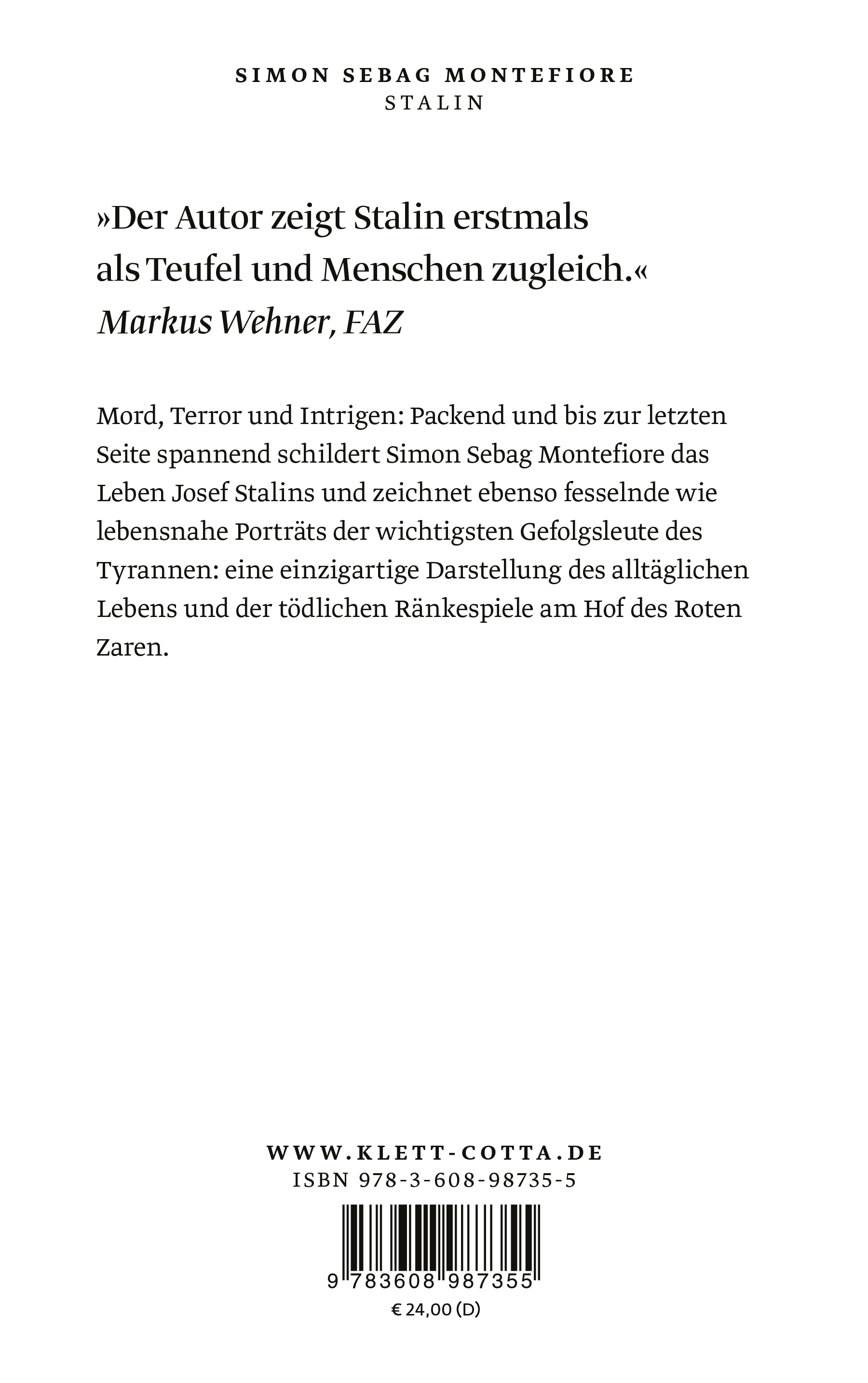 In seiner fulminanten und meisterhaft geschriebenen Biographie – voller Details aus Briefen, Tagebüchern und persönlichen Gesprächen – zeigt uns Simon Sebag Montefiore einen der grausamsten Diktatoren der Weltgeschichte als Herrscher und zugleich als skrupelloses Haupt eines ganzen Hofstaates. Dabei gewährt er überraschende Einblicke in das verborgene Leben, die mörderischen Intrigen und die tödlichen Machenschaften der Mitglieder des Politbüros und ihrer Familien. Eindrucksvoll beschreibt er die Beziehungen zwischen einem Menschheitsverbrecher und einer Kamarilla, die von enthemmter Gewaltbereitschaft ebenso geprägt sind wie von kleinbürgerlich idyllischen Alltagsfreuden. Schonungslos und mit atemberaubenden Sinn für die menschlichen Abgründe enhüllt einer der großen historischen Erzähler der Gegenwart die ganze Amoralität eines totalitären Regimes, dessen Erben uns bis heute heimsuchen.