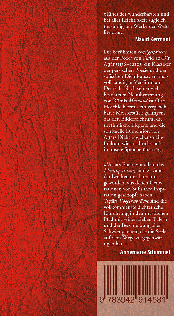 Die berühmten »Vogelgespräche« aus der Feder von Farid ad-Din Attar (1136–1220), ein Klassiker der persischen Poesie und der sufischen Dichtkunst, erstmals vollständig in Versform auf Deutsch. Nach seiner viel beachteten Neuübersetzung von Rumis »Masnawi« ist Otto Höschle hiermit ein vergleichbares Meisterstück gelungen, das den Bilderreichtum, die rhythmische Eleganz und die spirituelle Dimension von Attars Dichtung ebenso einfühlsam wie ausdrucksstark in unsere Sprache überträgt.