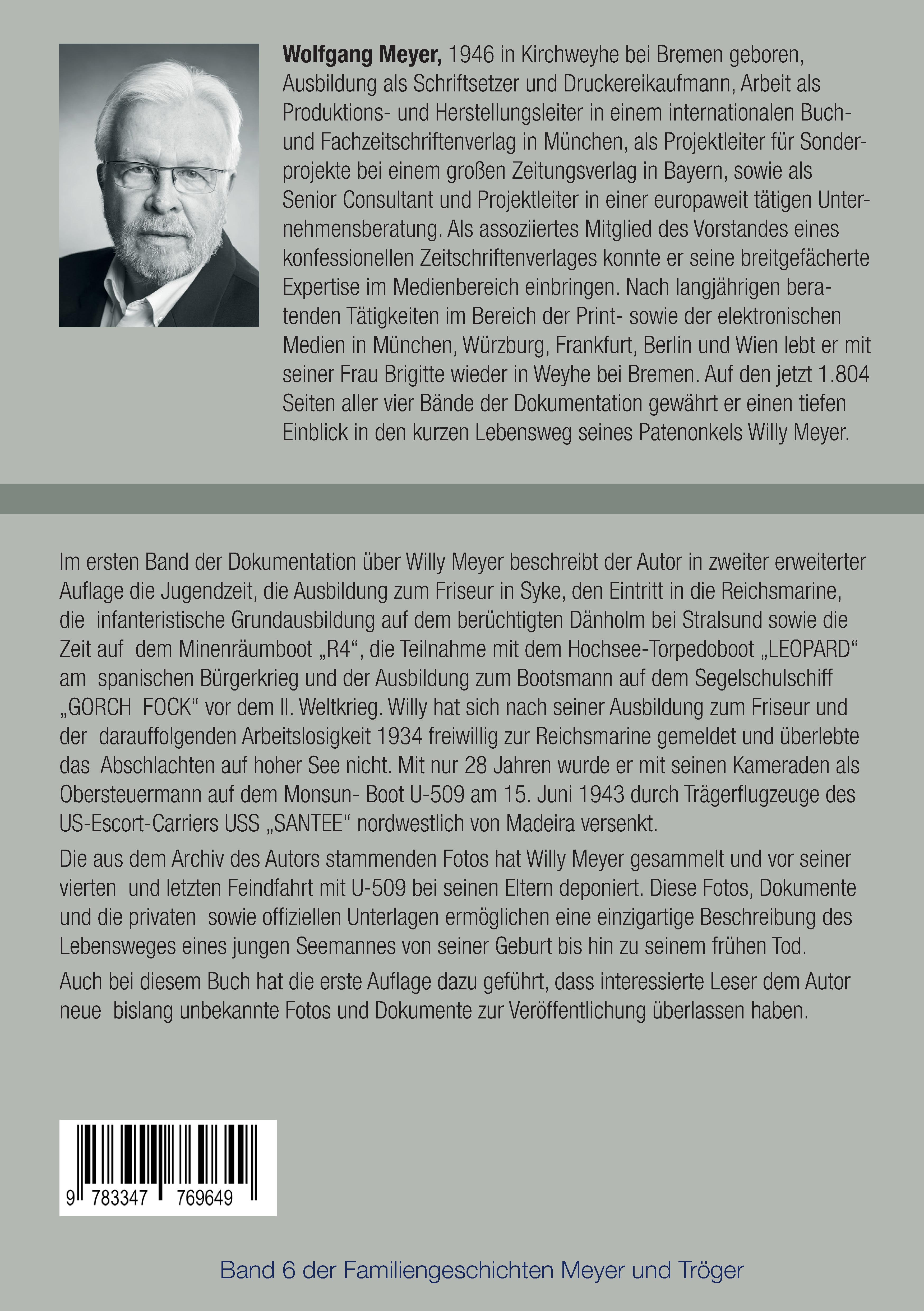 Wolfgang Meyer, 1946 in Kirchweyhe bei Bremen geboren, Ausbildung als Schriftsetzer und Druckereikaufmann, Arbeit als Produktions- und Herstellungsleiter in einem internationalen Buch- und Fachzeitschriftenverlag in München, als Projektleiter für Sonderprojekte bei einem großen Zeitungsverlag in Bayern, sowie als Senior Consultant und Projektleiter in einer europaweit tätigen Unternehmensberatung. Als assoziiertes Mitglied des Vorstandes eines konfessionellen Zeitschriften-Verlages konnte er seine breitgefächerte Expertise im Medienbereich einbringen. Nach langjährigen beratenden Tätigkeiten im Bereich der Print- und der elektronischen Medien in München, Würzburg, Frankfurt, Berlin und Wien lebt er mit seiner Frau Brigitte wieder in Weyhe bei Bremen. Er gewährt auf den 1.728 Seiten der fünf Bände der Dokumentation Einblick in den kurzen Lebensweg seines Patenonkels Willy Meyer. Die einzigartigen privaten Fotos und Dokumente wurden über viele Jahre sorgfältig archiviert und werden jetzt im Kontext mit den Unterlagen anderer, auch internationaler Archive, erstmals veröffentlicht.