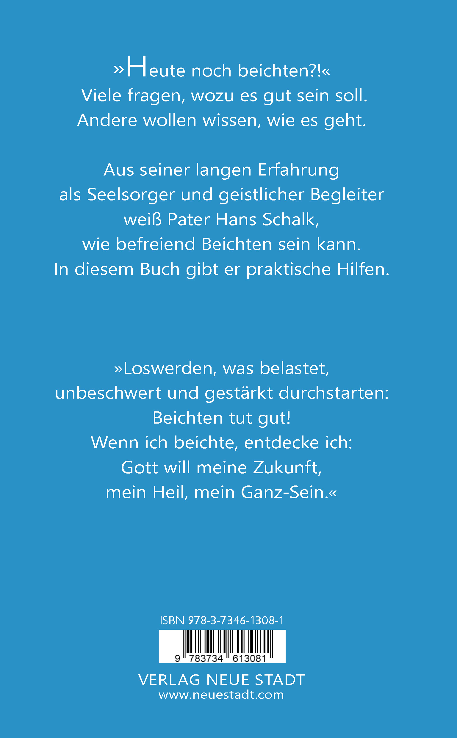 Beichten befreitDAS BEICHTEN NEU ENTDECKEN»Heute noch beichten?!« Viele fragen, wozu es gut sein soll.Andere wollen wissen, wie es geht.Aus seiner langen Erfahrung als Seelsorger und geistlicher Begleiter weiß Hans Schalk, wie befreiend Beichten sein kann. In diesem Buch gibt er praktische Hilfen.»Loswerden, was belastet, unbeschwert und gestärkt durchstarten:Beichten tut gut!Wenn ich beichte, entdecke ich:Gott will meine Zukunft, mein Heil, mein Ganz-Sein.«(Hans Schalk)
