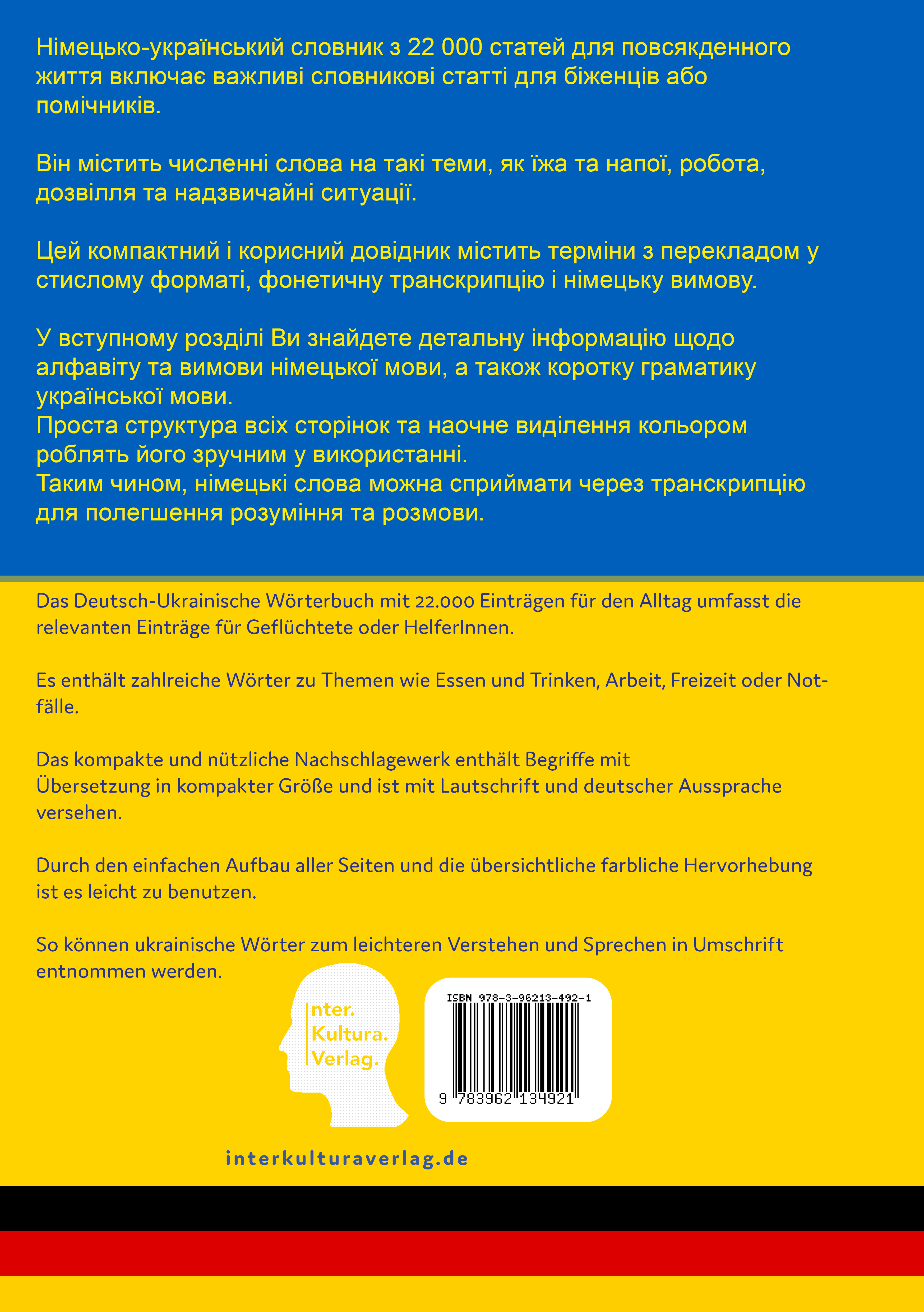 Das Deutsch-Ukrainische Wörterbuch mit 22.000 Einträgen für den Alltag umfasst die relevanten Einträge für Geflüchtete oder Helfer.Es enthält zahlreiche Wörter zu Themen wie Essen und Trinken, Arbeit, Freizeit oder Notfälle.Das kompakte und nützliche Nachschlagewerk enthält Begriffe mit Übersetzung in kompakter Größe und ist mit Lautschrift und deutscher Aussprache versehen.Im Einleitungsteil finden Sie ausführliche Hinweise zum Alphabet und zur Aussprache des Deutschen und Ukrainischen sowie eine Kurzgrammatik. Durch den einfachen Aufbau aller Seiten und die übersichtliche farbliche Hervorhebung ist es leicht zu benutzen. So können ukrainische Wörter zum leichteren Verstehen und Sprechen in Umschrift entnommen werden.