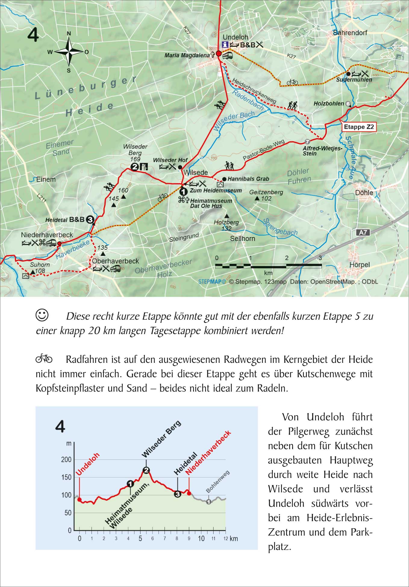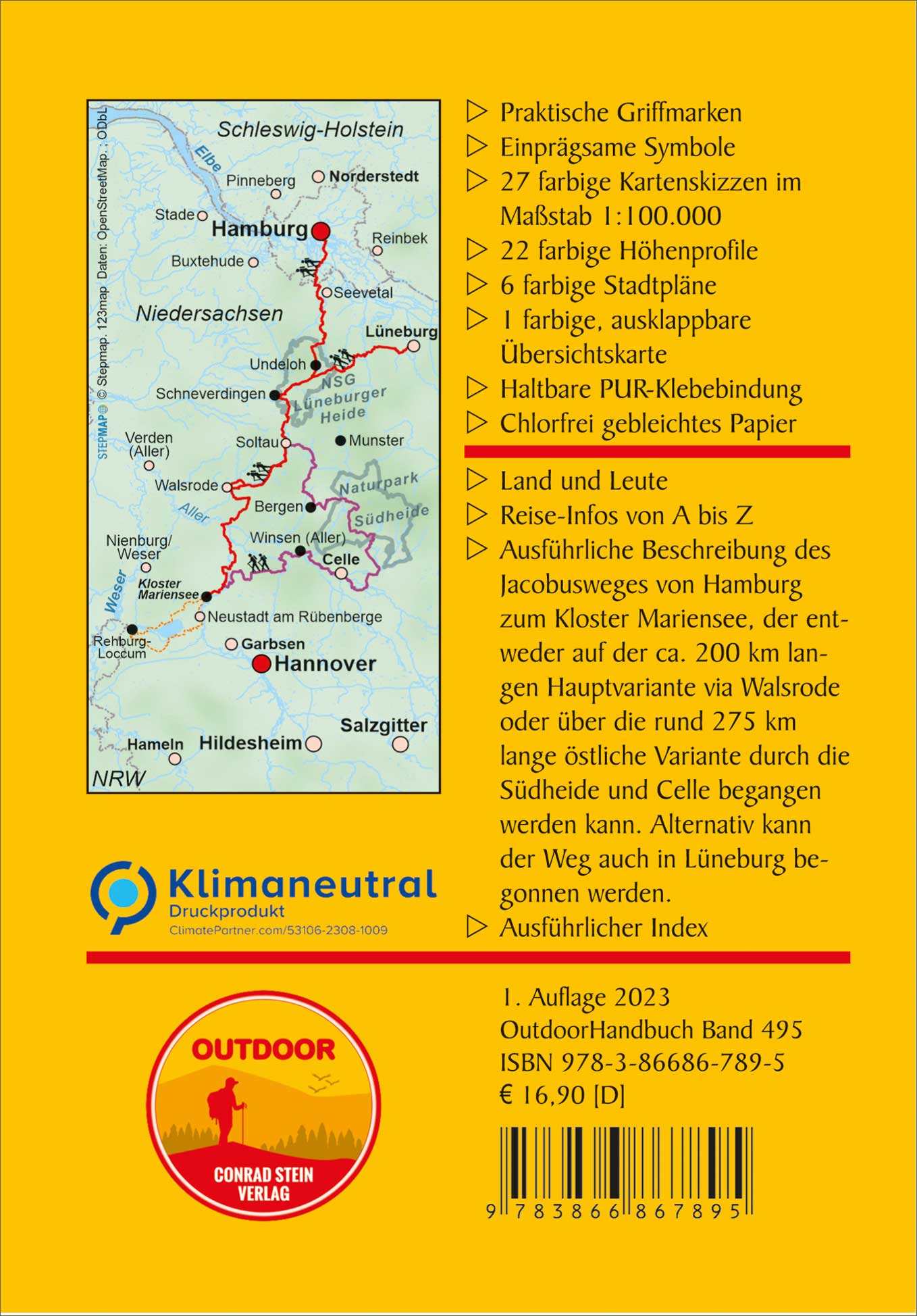 Einleitung, Land und Leute, Reise-Infos von A bis Z, Jacobusweg von Hamburg nach Soltau (6 Etappen), (Westliche) Hauptvariante von Soltau via Walsrode (4 Etappen), Östliche Variante von Soltau durch die Südheide und Celle (10 Etappen), Zubringer aus Lüneburg nach Wilsede (2 Etappen).