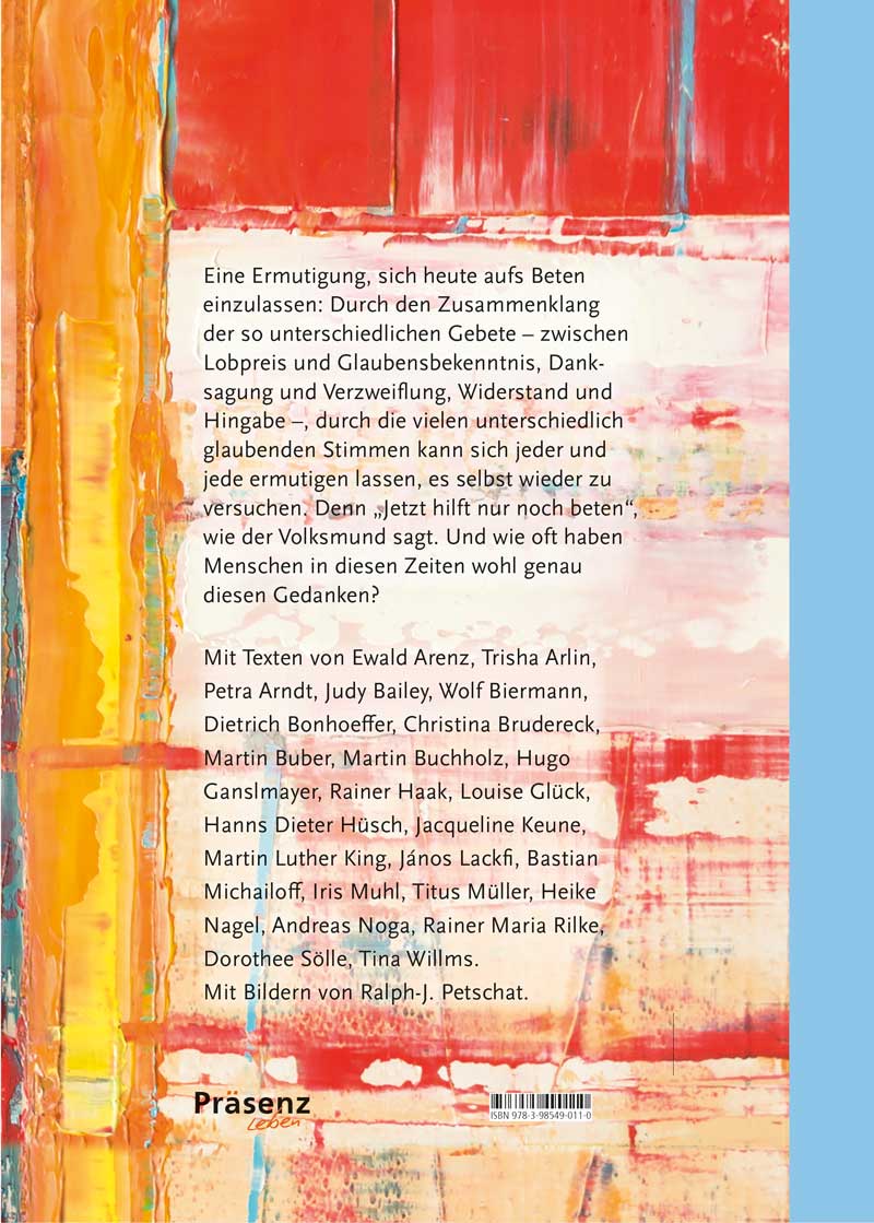 Eine Ermutigung, sich heute aufs Beten einzulassen: Durch den Zusammenklang der so unterschiedlichen Gebete - zwischen Lobpreis und Glaubensbekenntnis, Danksagung und Verzweiflung, Widerstand und Hingabe -, durch die vielen unterschiedlich glaubenden Stimmen kann sich jeder und jede ermutigen lassen, es selbst wieder zu versuchen. Denn "Jetzt hilft nur noch beten", wie der Volksmund sagt. Und wie oft haben Menschen in krisengeschüttelten Zeiten wohl genau diesen Gedanken? In einen Dialog mit den Gebeten treten die Bilder von Ralph-J. Petschat. Ihre lebendige Wirkung entsteht durch die eigenständige, künstlerische Technik, Fotografie, Druck und Malerei zu einem Werk zusammenzufügen. Durch die Reduktion der Fotovorlagen auf das Wesentliche entsteht eine lebendige Ruhe - und an dieser Stelle treffen sich Kunst und Gebet. Mit Texten von Ewald Arenz, Petra Arndt, Judy Bailey, Wolf Biermann, Dietrich Bonhoeffer, Christina Brudereck, Martin Buber, Martin Buchholz, Hugo Ganslmayer, Rainer Haak, Louise Glück, Hanns Dieter Hüsch, Jacqueline Keune, Martin Luther King, János Lackfi, Bastian Michailoff, Iris Muhl, Titus Müller, Heike Nagel, Andreas Noga, Rainer Maria Rilke, Dorothee Sölle, Tina Willms.