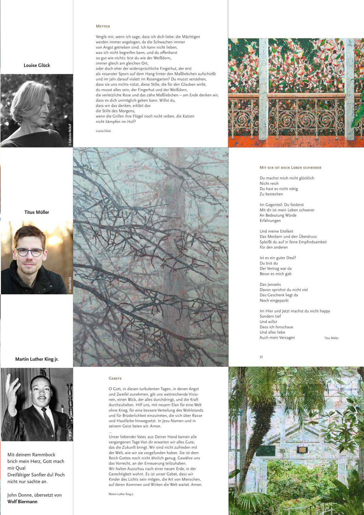 | Co-Autor | Petra Arndt Mit Texten von Ewald Arenz Judy Bailey Wolf Biermann Dietrich Bonhoeffer Christina Brudereck Martin Buber Martin Buchholz Hugo Ganslmayer Rainer Haak Louise Glück Hanns Dieter Hüsch Jacqueline Keune Martin Luther King, Bastian Michailoff János Lackfi Iris Muhl Titus Müller Heike Nagel Andreas Noga Rainer Maria Rilke Dorothee Sölle Tina Willms |