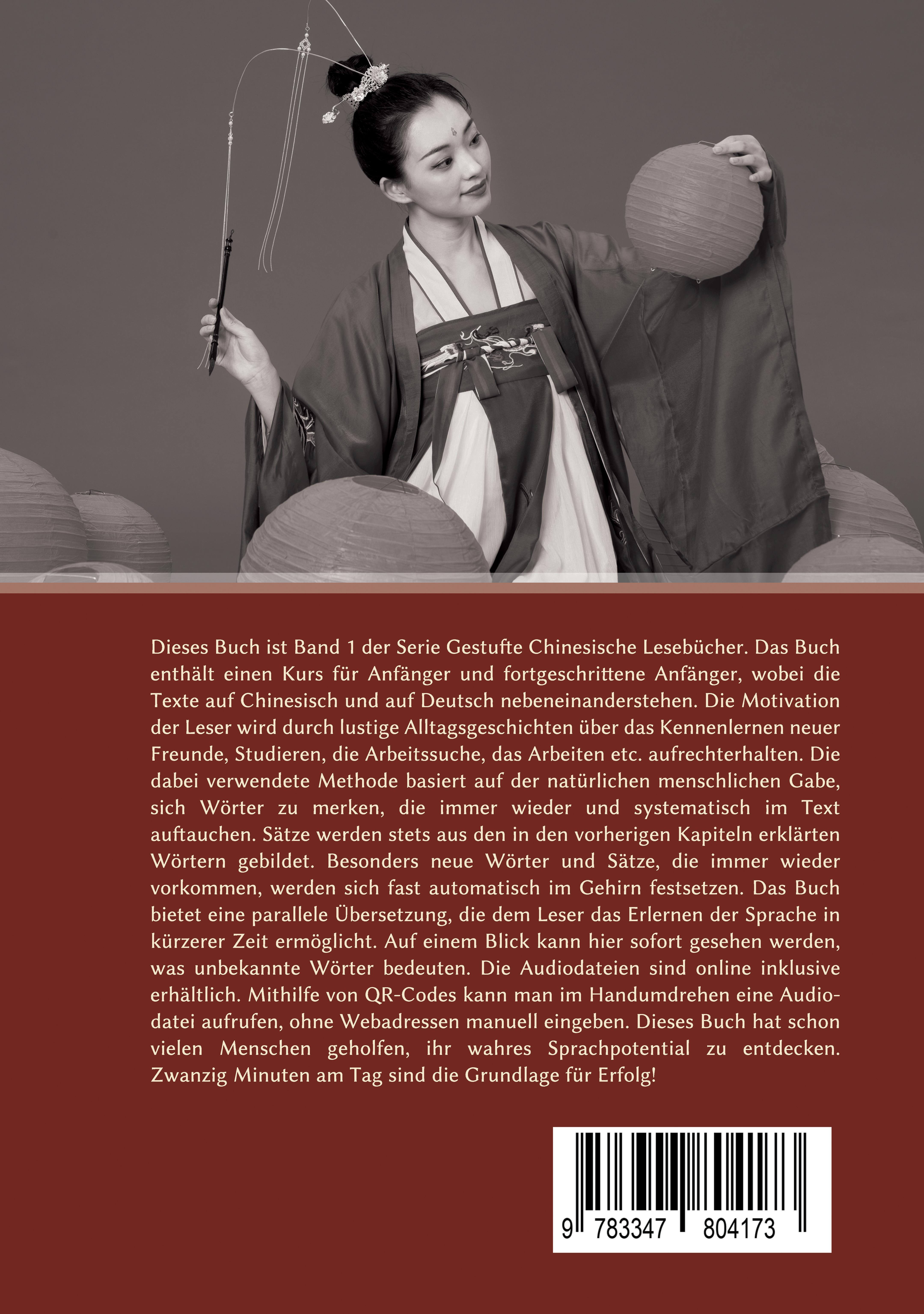 Dieses Buch ist Band 1 der Serie Gestufte Chinesische Lesebücher. Das Buch enthält einen Kurs für Anfänger und fortgeschrittene Anfänger, wobei die Texte auf Chinesisch und auf Deutsch nebeneinanderstehen. Die Motivation der Leser wird durch lustige Alltagsgeschichten über das Kennenlernen neuer Freunde, Studieren, die Arbeitssuche, das Arbeiten etc. aufrechterhalten. Die dabei verwendete Methode basiert auf der natürlichen menschlichen Gabe, sich Wörter zu merken, die immer wieder und systematisch im Text auftauchen. Sätze werden stets aus den in den vorherigen Kapiteln erklärten Wörtern gebildet. Besonders neue Wörter und Sätze, die immer wieder vorkommen, werden sich fast automatisch im Gehirn festsetzen. Das Buch bietet eine parallele Übersetzung, die dem Leser das Erlernen der Sprache in kürzerer Zeit ermöglicht. Auf einem Blick kann hier sofort gesehen werden, was unbekannte Wörter bedeuten. Die durch die Pinyin-Umschrift angegebene Aussprache basiert auf dem Hochchinesischen ( / , p t nghuà). Die Audiodateien sind online inklusive erhältlich. Mithilfe von QR-Codes kann man im Handumdrehen eine Audiodatei aufrufen, ohne Webadressen manuell eingeben. Dieses Buch hat schon vielen Menschen geholfen, ihr wahres Sprachpotential zu entdecken. Zwanzig Minuten am Tag sind die Grundlage für Erfolg!
